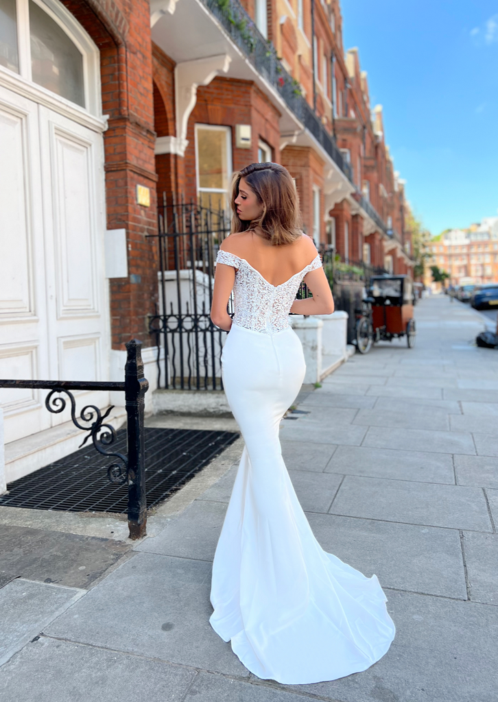 A gorgeous full length gown by Australian Designer Jadore, Style JX6077. Featuring an off the shoulder, sweetheart neckline with a bodice complete with a stunning embellished bodice detailing. This form fitting gown is finished with a mermaid style skirt and a long back train.