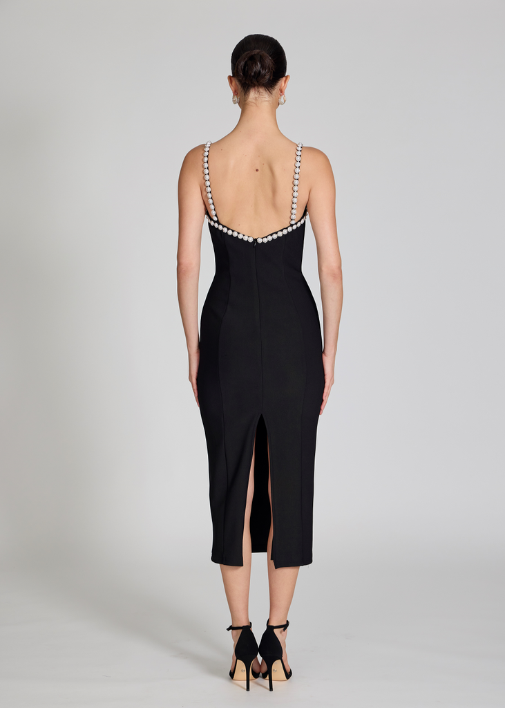 The Gisella Pearl Detail Midi Dress by Romance the Label blends timeless sophistication with contemporary charm. Its form-fitting pencil silhouette flatters your figure, while delicate pearl accents add a touch of radiance. This dress exudes elegance and femininity and is perfect for confident fashion-forward individuals.