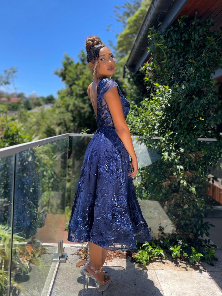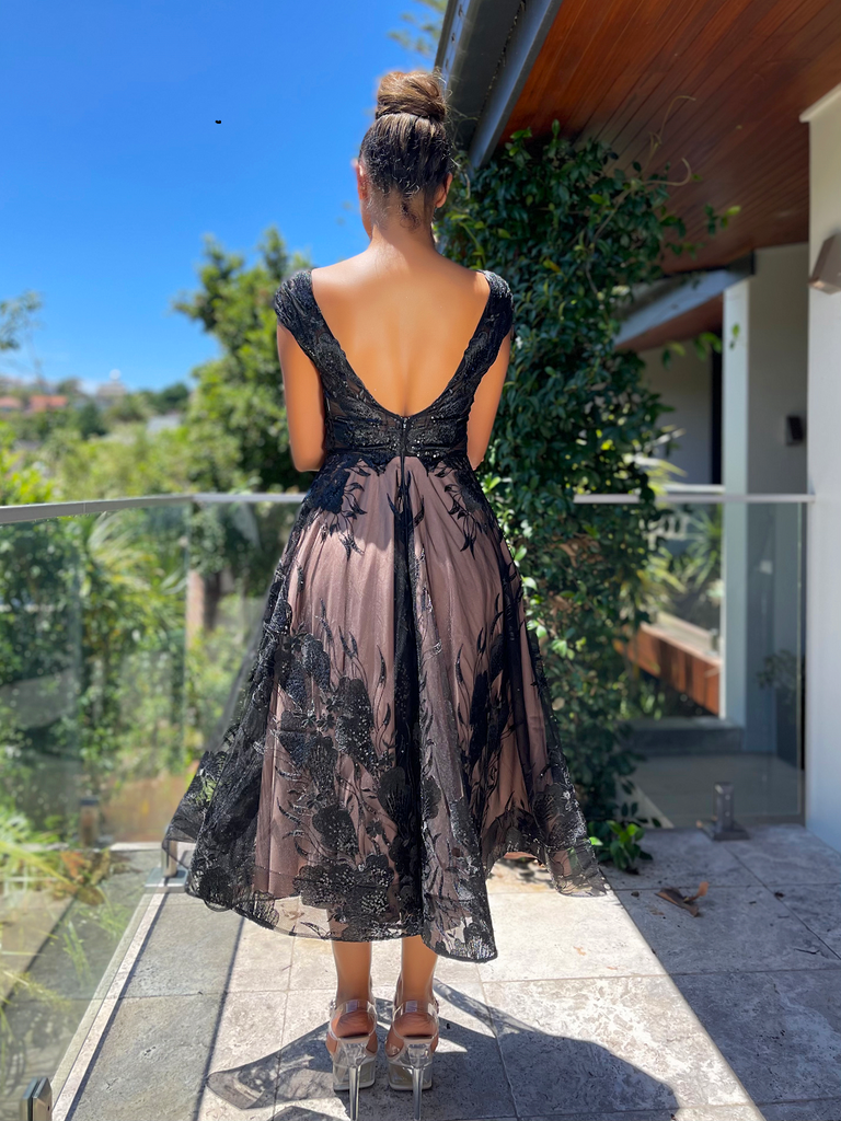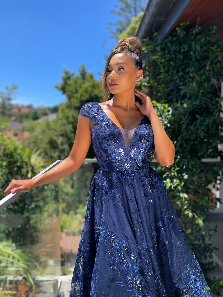 A stunning full length gown by Australian Designer Jadore, Style JX5052. The gorgeous Ada midi is detailed with floral lace features and a low-cut bodice, but is also designed with a v back including cap sleeves. The gown is cinched at the waistline before flaring out into a stunning skirt to create a ball gown silhouette.