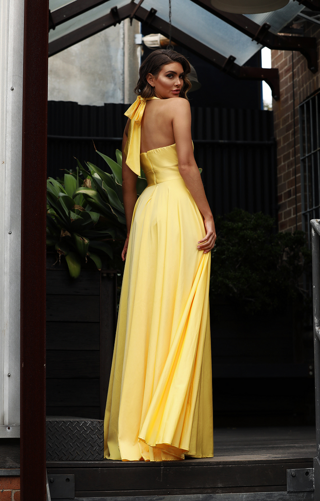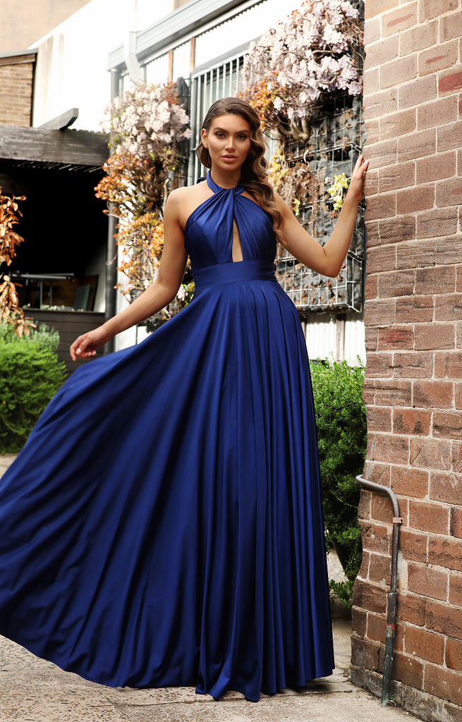 A gorgeous full length gown by Australian Designer Jadore, Style JX3068. Featuring a halter neckline with a bow detailing along the back of the neck, complete with a keyhole detailing on the bodice. This stunning gown is fitted at the waistline before flaring out to create an elegant A-line silhouette.