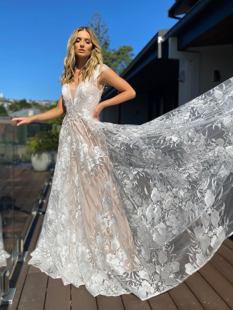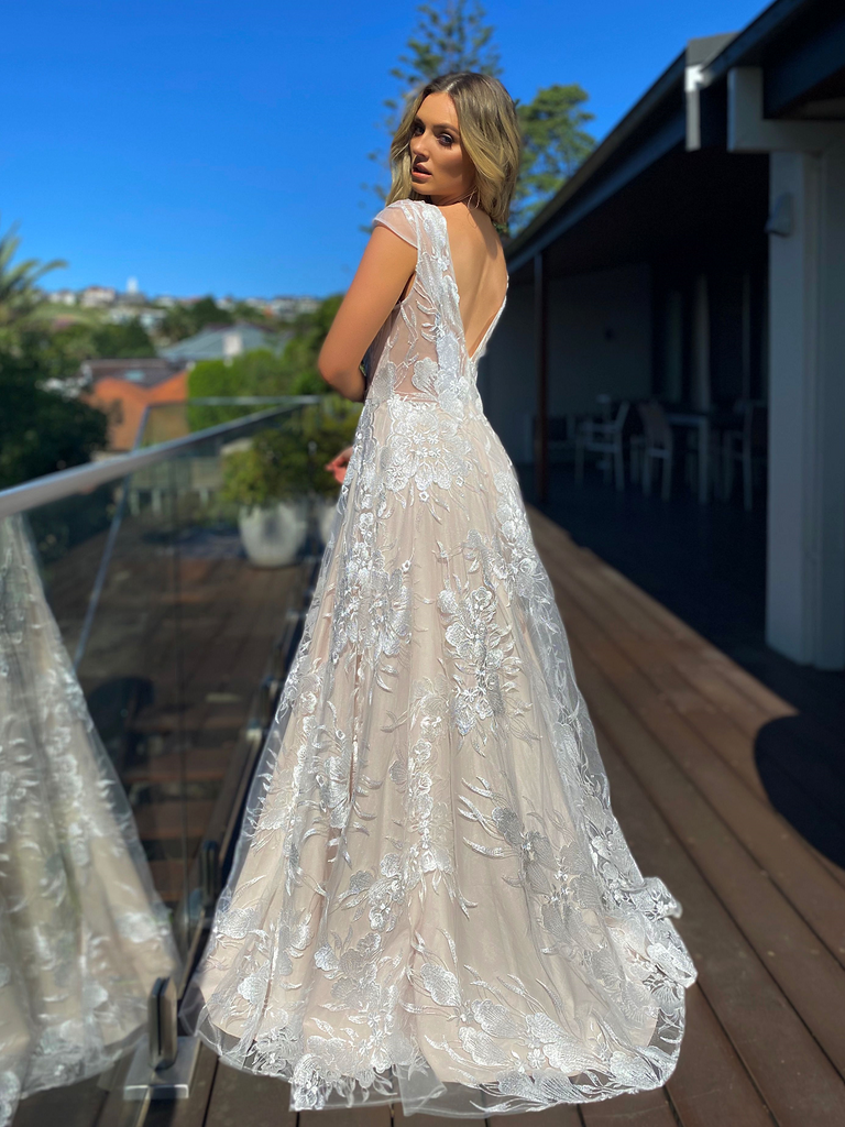A stunning full length gown by Australian Designer Jadore, Style JX5036. This gorgeous floral lace detailed gown features a low-cut bodice, but is also designed with a v back including cap sleeves. The gown is cinched at the waistline before flaring out into a stunning skirt to create a ball gown silhouette.