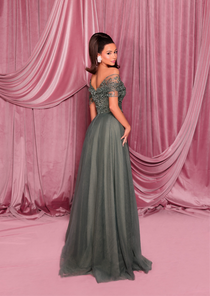 The Charmed Gown style NC3033 by Nicoletta is a full-length dress with sparkling beads, a flattering sweetheart neckline, and elegant off-the-shoulder sleeves. Designed to highlight your best features, it’s the perfect choice to stand out and impress.