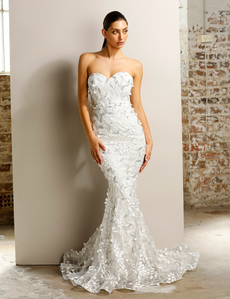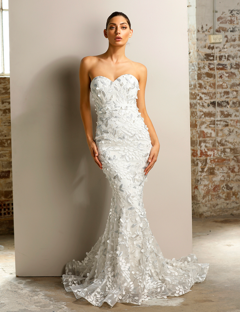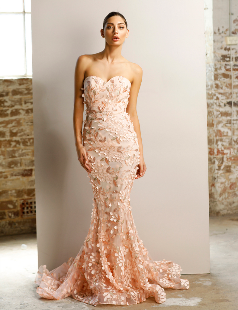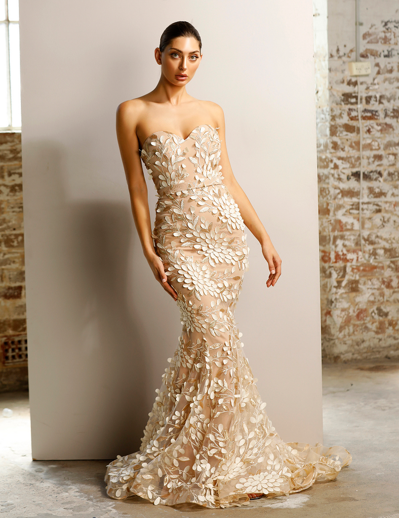 A beautiful full length evening gown by Australian designer Jadore style JX1097. Featuring a sweetheart neckline with a mermaid style cut and a waist band. The is highlighted with a intricate 3D leaf detailing though out.