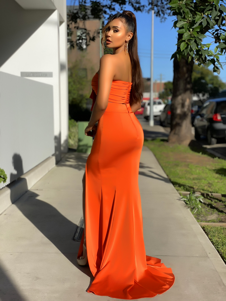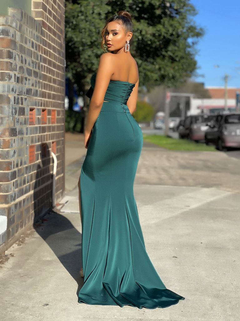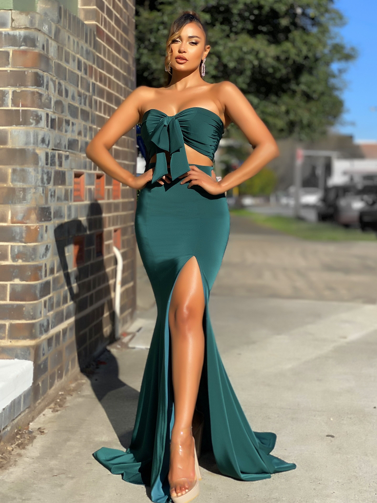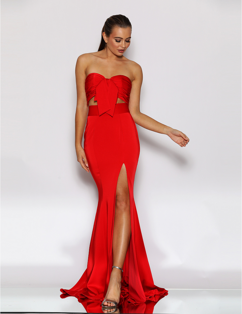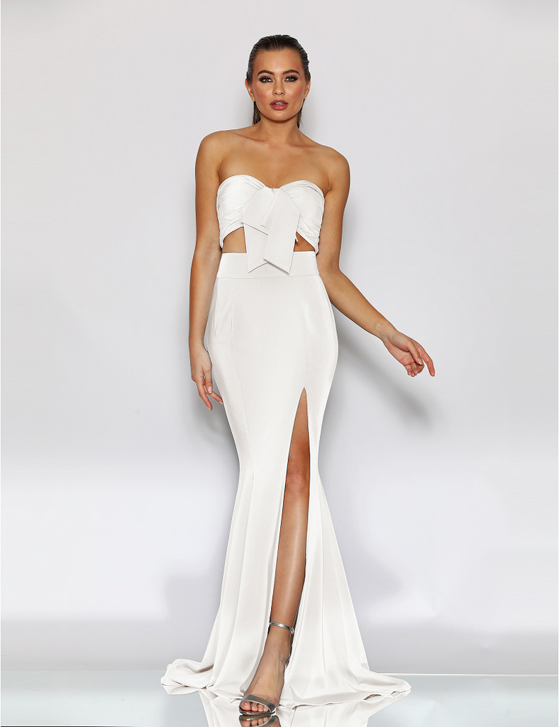 A beautiful two piece gown by Australian designer Jadore, style JX2043. Featuring a sweetheart neckline, with a bow detailing on the front bodice. The Hailey gown also features a side split, and is finished with a small back train.