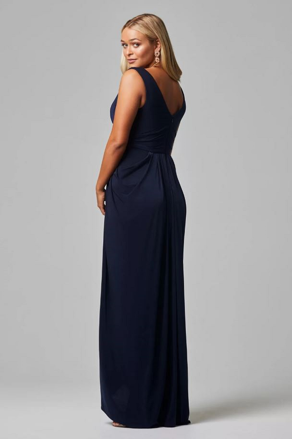 A beautiful full length dress by Australian Designer Tania Olsen, Style TO817. The Kalani dress is made of a soft jersey knit and features a v-neckline with elegant draping along the torso, it is drawn at the waist, and is finished with a sultry leg split.