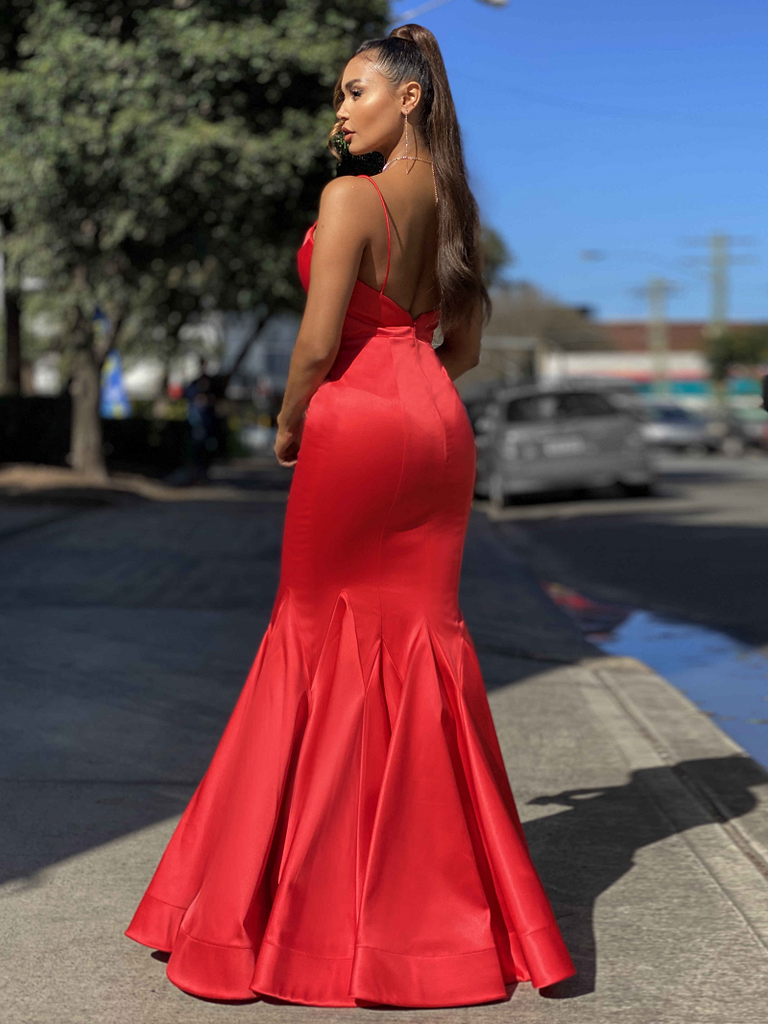 A stunning full length gown by Australian Designer Jadore, Style JX4082. Featuring Spaghetti straps and a sweetheart neckline with a scooped overlay detailing on the bust. This form fitting dress is finished with a low back, and is complete with a mermaid style skirt.