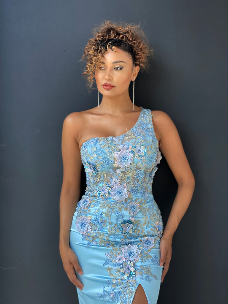 A gorgeous full length gown by Australian Designer Jadore, Style JX4007. A stunning 3D floral applique detailing covers the sheer bodice, and continues down the length of the Zahra Gown. This form fitting style features a one shoulder design, complete with a high side split.