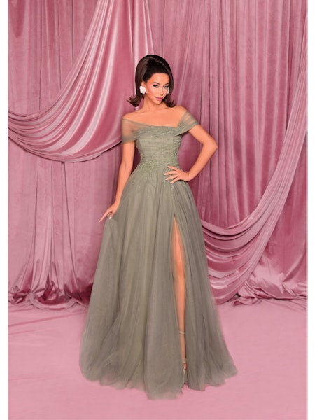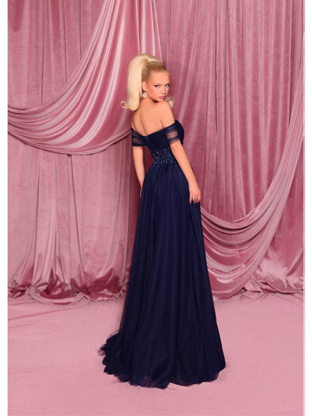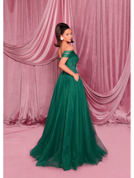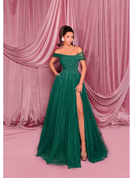 The Dark Night Gown NC3017 by Nicoletta is a dazzling full-length dress designed to turn heads. With its glittering bodice adorned with jewel straps and a flirty off-the-shoulder neckline, it hugs your waist before flowing into a breathtaking ball gown skirt. Step out and steal the spotlight in this fabulous showstopper!