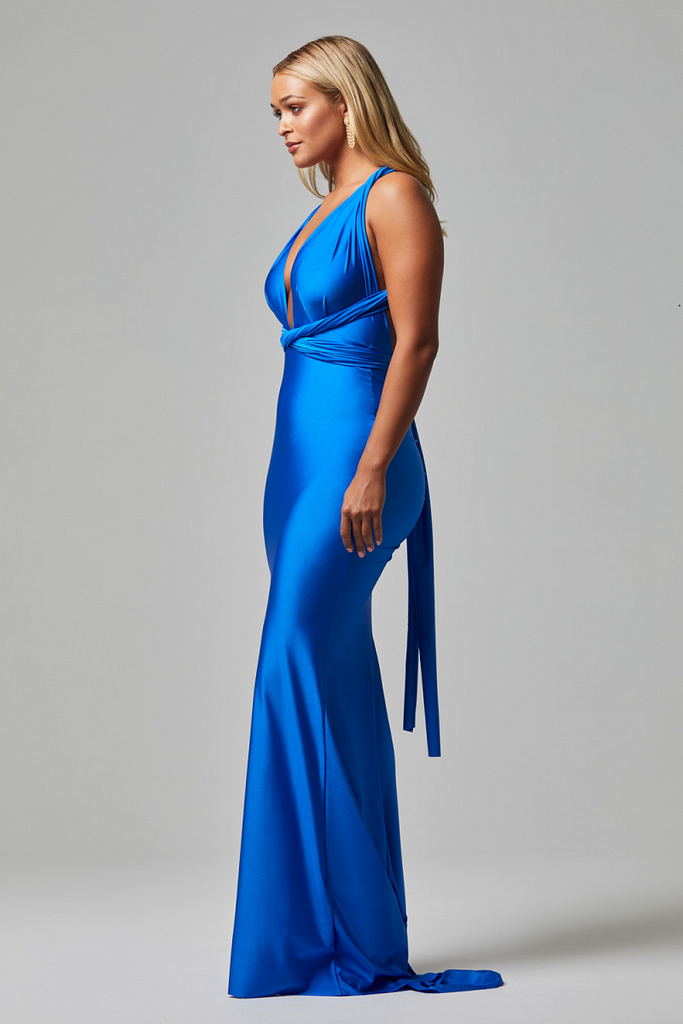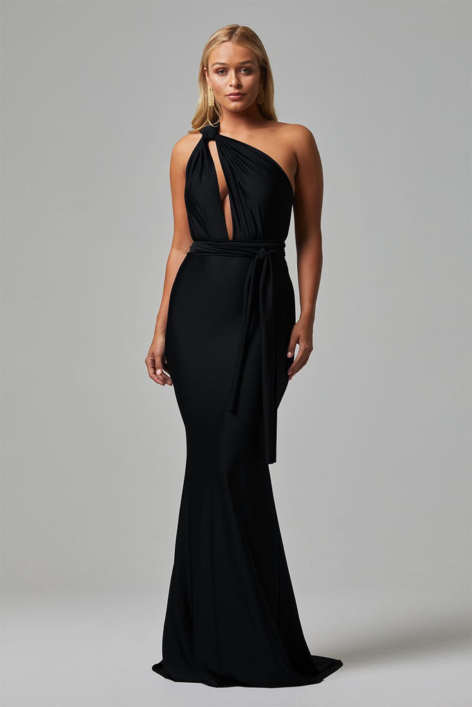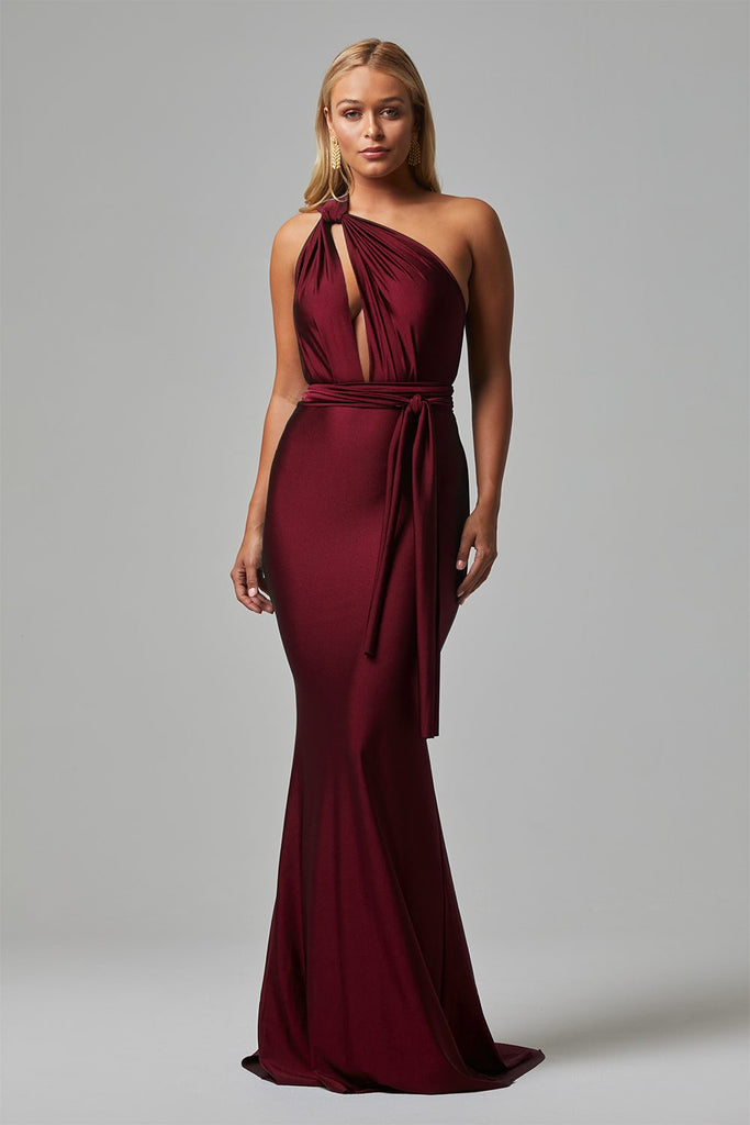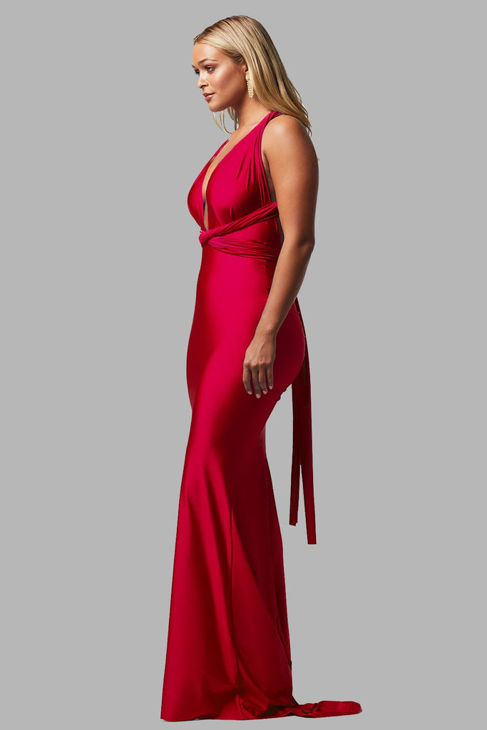 A beautiful full length style by Australian Designer Tania Olsen, Style PO31F. Dress to impress in the Eternity Fitted Wrap Gown, made with luxury stretch jersey fabric. Wear this dress multiple ways with the versatile neck tie.