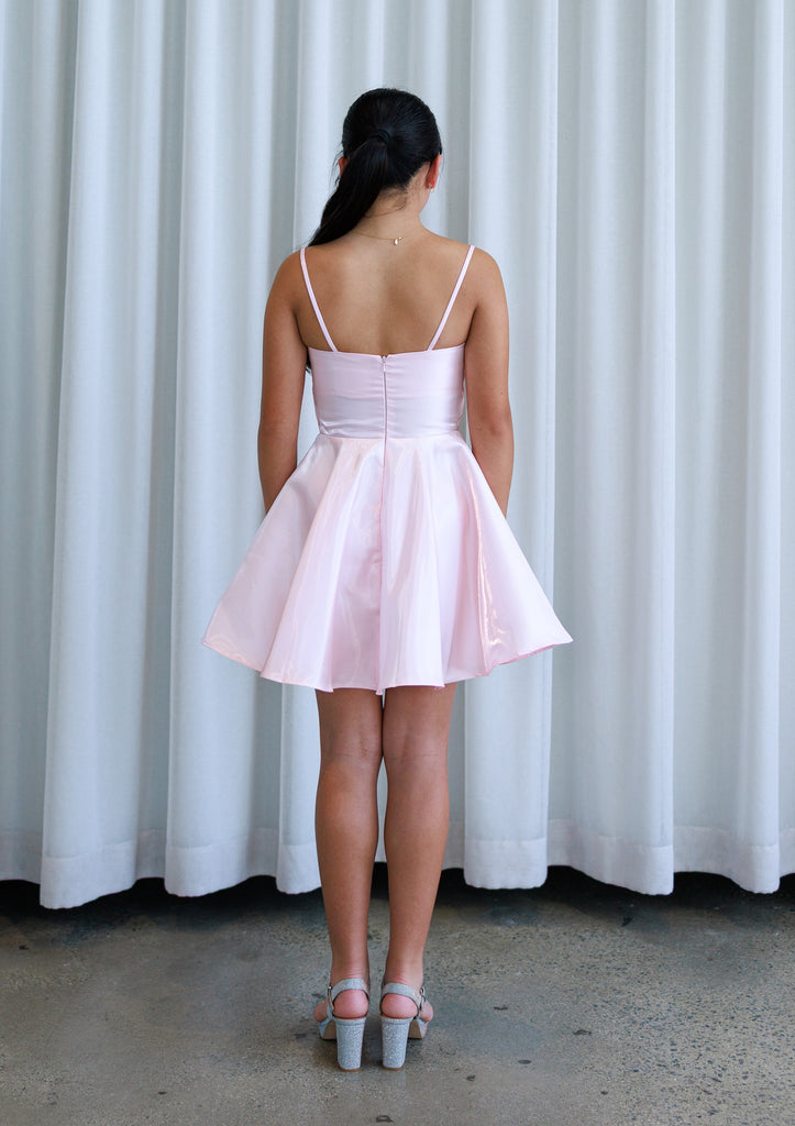 The charming Sunset Swirl Dress combines classic femininity with playful flair, making it perfect for dancing the night away. In a soft, pale pink with a subtle sheen, the dress features a smooth satin-like fabric that gives the skirt structure while maintaining a lustrous finish. Its fit-and-flare silhouette accentuates the waist, complemented by a sweetheart neckline and delicate adjustable spaghetti straps. The voluminous skater skirt moves gracefully, creating a fun and flirty look, ideal for homecoming, dances, engagement parties, or bridal and baby showers.