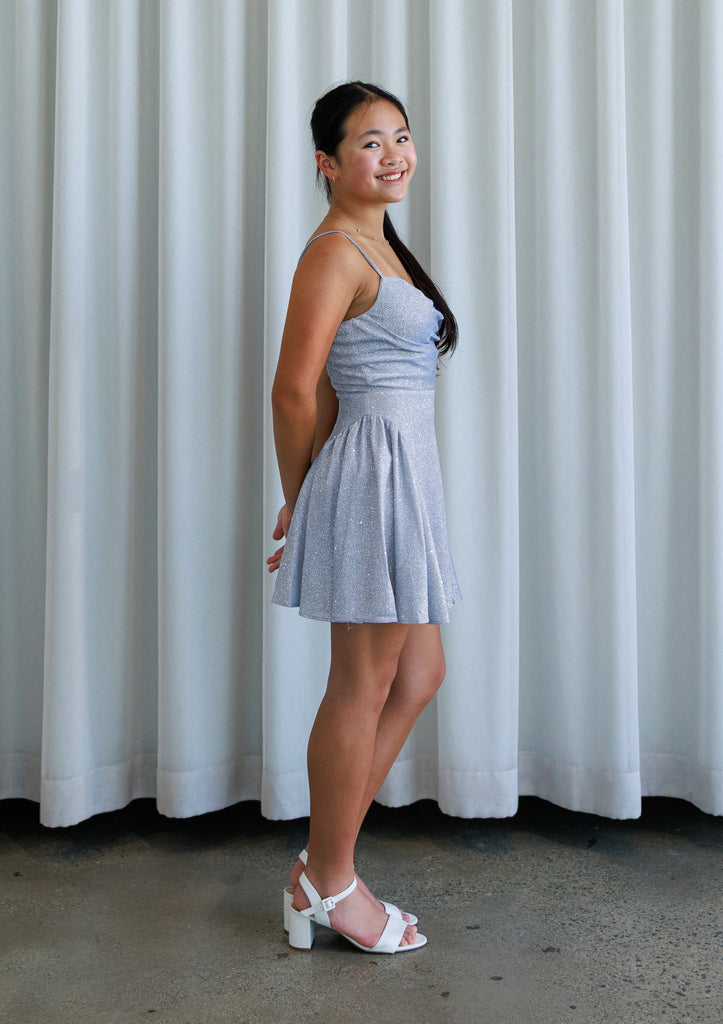 The Sweet Escape Dress (BP1012) is playful yet glamorous and is designed to make you shine at any special occasion. Crafted from a sparkling light blue lurex, it glimmers beautifully under the light, giving off an icy, ethereal glow. The flattering fit-and-flare silhouette cinches at the waist before flowing into a voluminous skater-style mini skirt — perfect for twirling the night away. A softly draped cowl neckline and delicate spaghetti straps add a touch of elegance, while the stretch lurex fabric ensures a comfortable, figure-hugging fit. The ultimate blend of youthful charm and party-ready glamour, this dress is made for homecoming, graduations, birthdays, and every celebration in between.