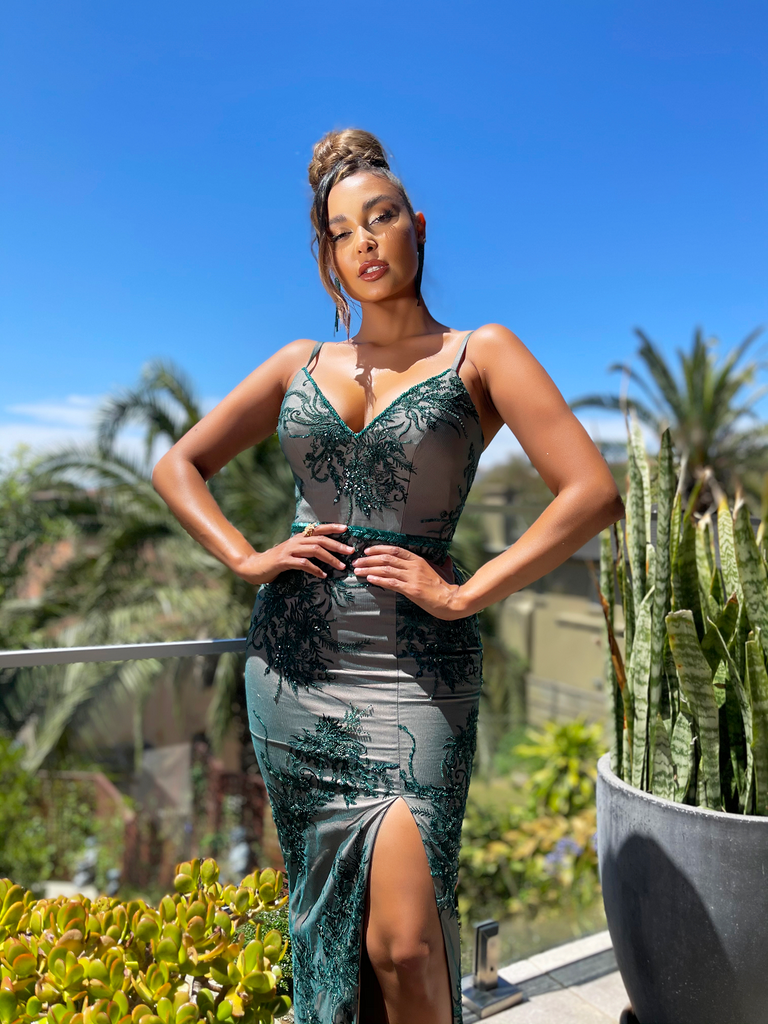 Be captivated by Australian Designer Jadore's JX5034 full-length gown. Showcasing a v-neckline, its exquisite lace applique decorates the Willow Gown from top to bottom. This flattering fitted gown comes with a high side split for added drama.