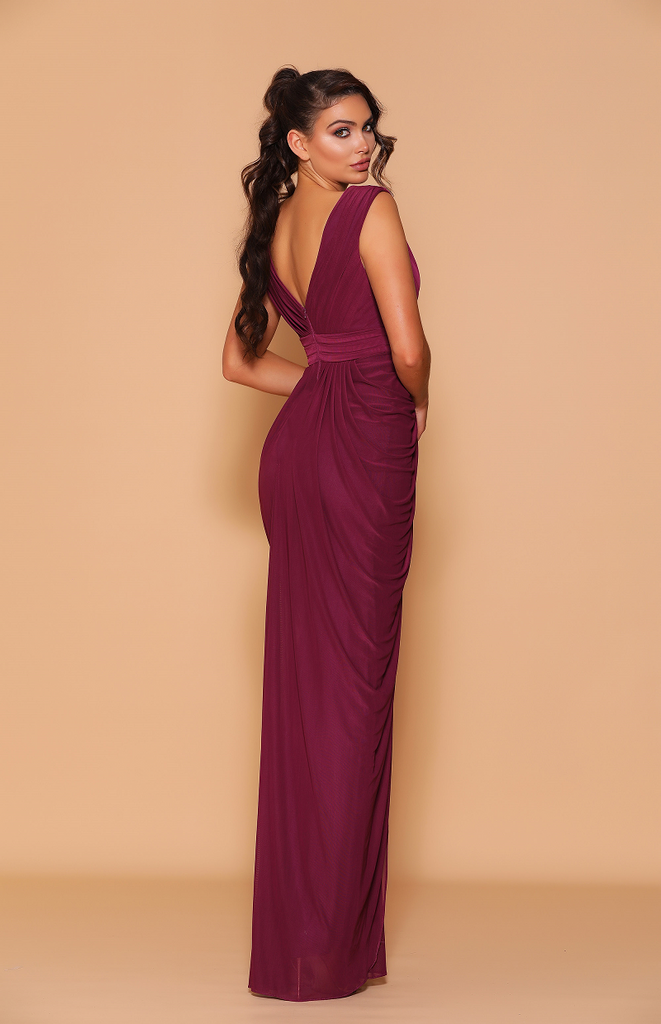 A stunning full length gown by Australian Designer Les Demoiselle, Style LD1046M. Made of a Lycra Mesh fabric, the Leia Gown features a lovely ruched detailing along the bodice, which also features a V-neckline and a V-cut back. The Leia Gown is fitted at the waistline, and features a gorgeous draped skirt, which is complete with a high, asymmetrical front split.
