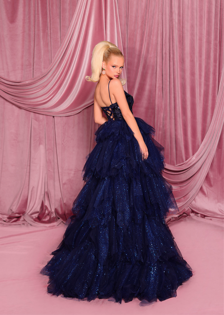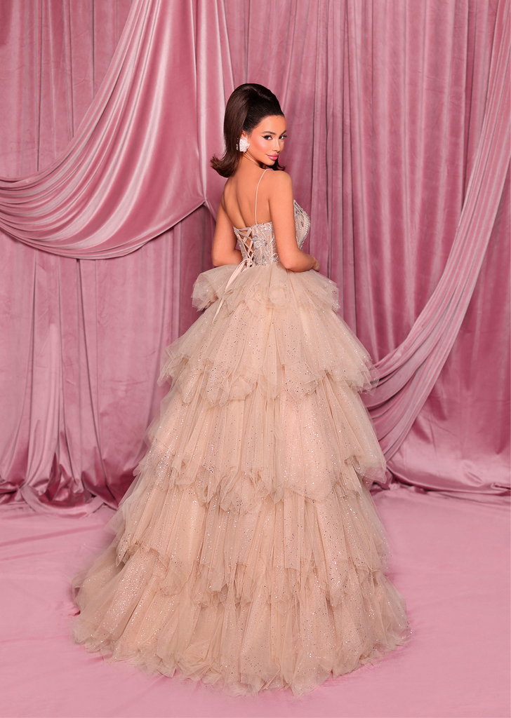 The Gone With The Wind Gown NC3011 by Nicoletta is a beautiful ball gown with delicate straps and a sweetheart neckline, covered in soft, sparkly layered tulle. It’s perfect for a fun and charming look.