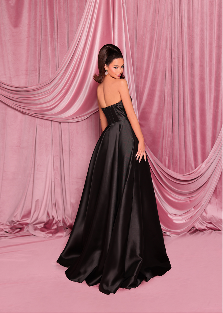 Designed by Australian designer Nicoletta, the Anahi Gown style NC3096 is a beautiful floor-length dress featuring a ruched strapless boat neckline embellished with delicate beading on the trim. It showcases a cinched waist and an A-line silhouette that flows elegantly, finished with a striking side slit.