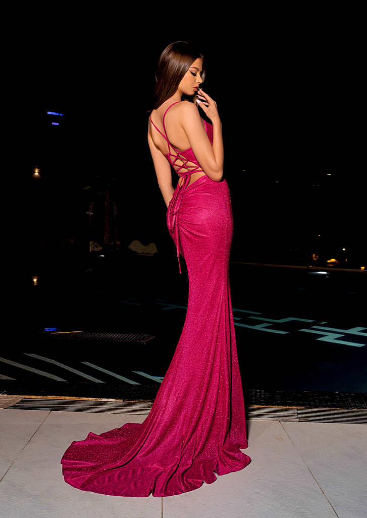 Get ready to fall in love with the Addeline Gown, created by the fashion mastermind Nicoletta from down under. This dress (NC2014) features a lovely spaghetti strap sweetheart neckline, ruched torso and a defined waist, along with a bold thigh-high slit and a mini train in the back. Prepare to be dazzled by the glimmering Lurex fabric - it's simply divine!