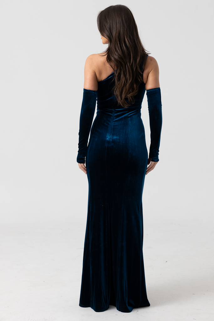 Experience luxury and elegance with the Alegra One Shoulder Maxi by Australian Designer Romance The Label. This stunning gown boasts a one shoulder neckline and intricate ruched detailing on the torso. Made of luxurious velvet fabric, it cascades into a mermaid style skirt and includes detachable sleeves for added versatility. Elevate your style and feel like a goddess in Alegra!