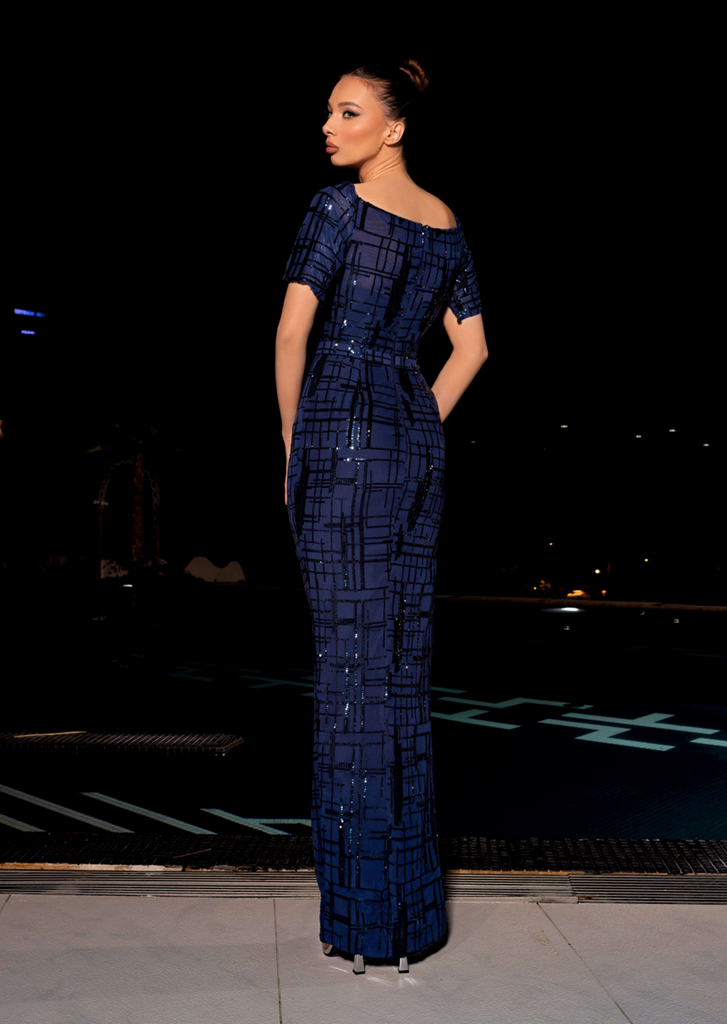 Be the belle of the ball in the Alidia Gown, designed by Australian fashion guru Nicoletta. The exquisite sequin embellishments highlight the full length of this elegant dress, while the boat neckline and short sleeves add a touch of charm. Don't forget the side split for an extra dose of flair.
