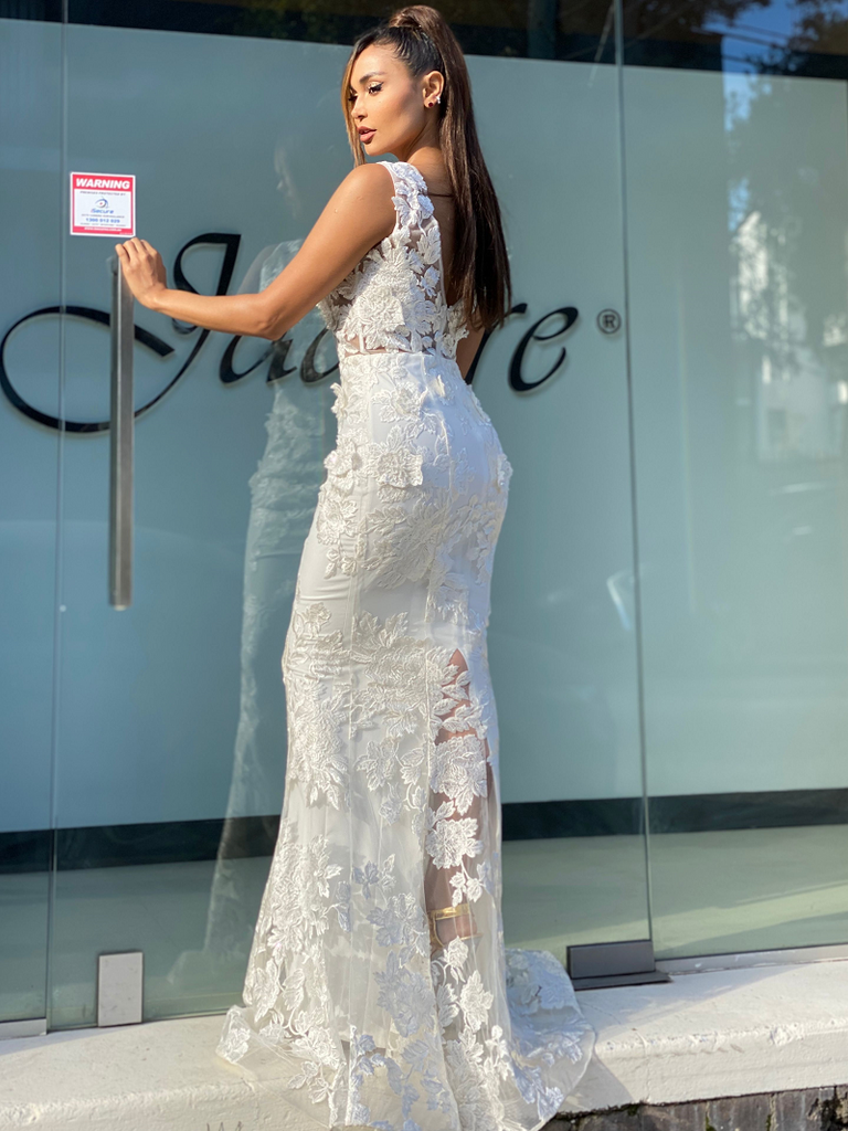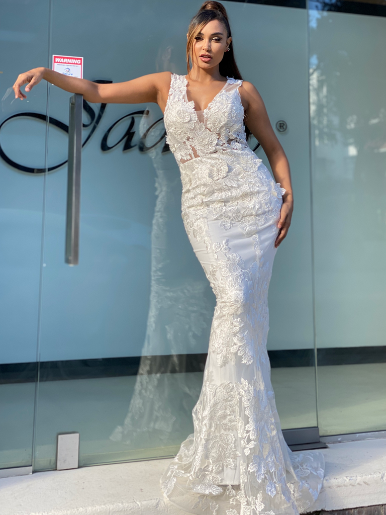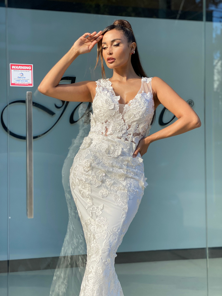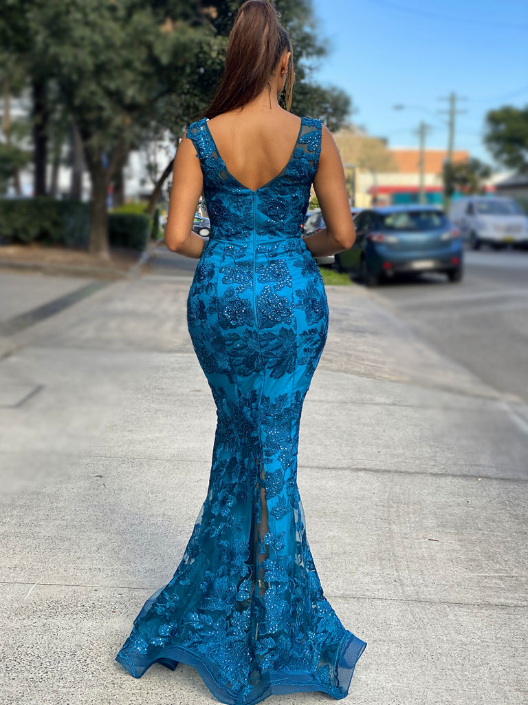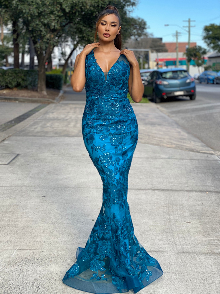 An elegant full length gown by Australian Designer Jadore, Style JX4063. A stunning floral applique detailing, complete with small sequins covers the length of the Amal Gown. This form fitting, mermaid style gown also features a v-neckline with a mesh insert, as well as a v-cut back and is finished with a back split, complete with a sheer overlay.