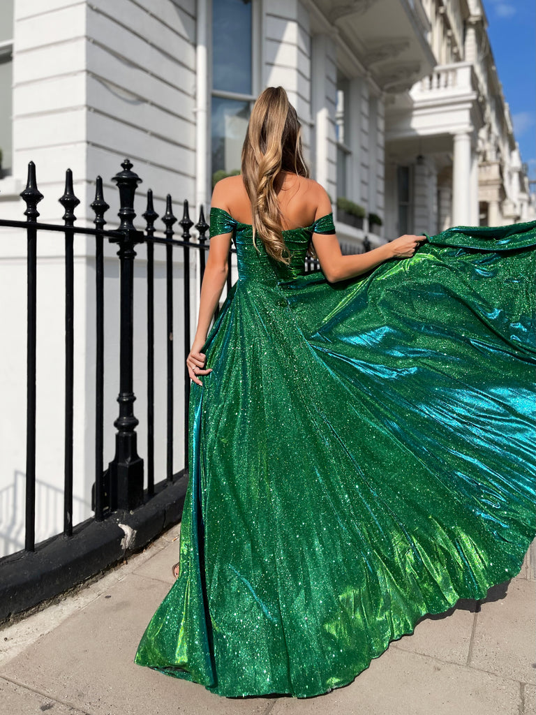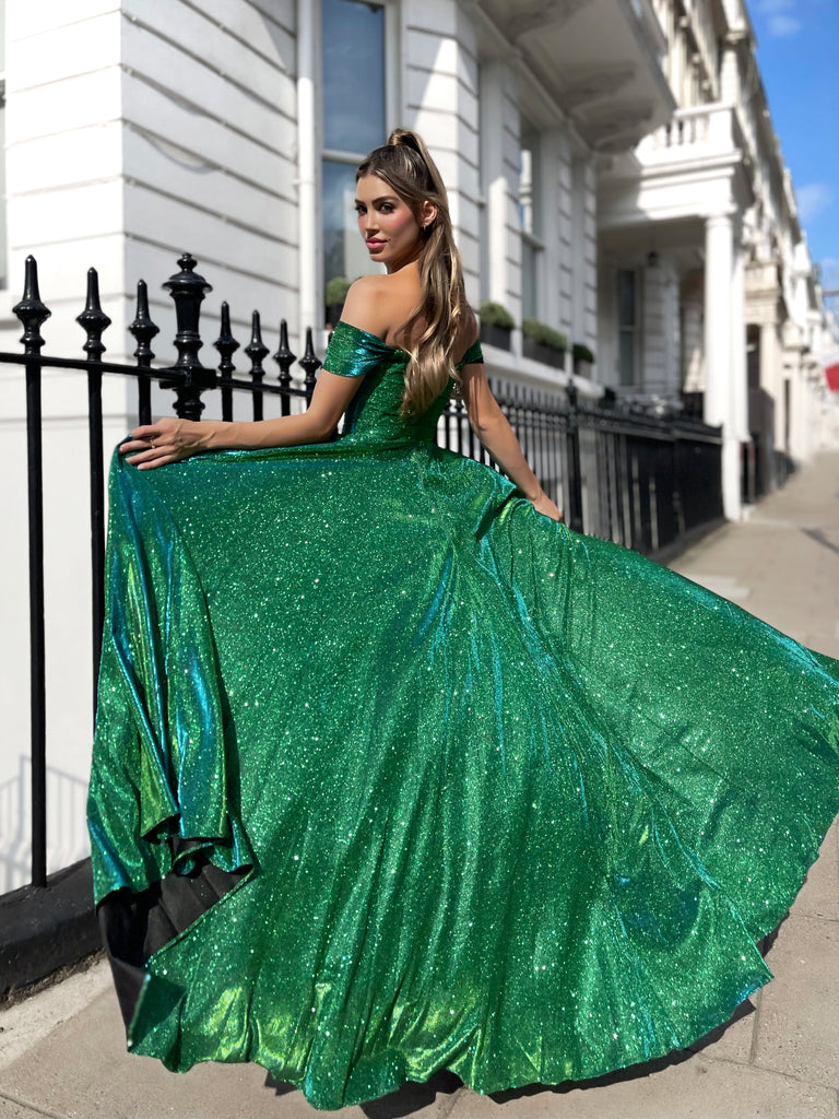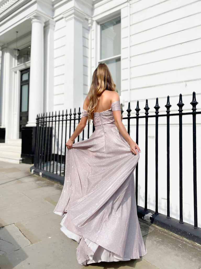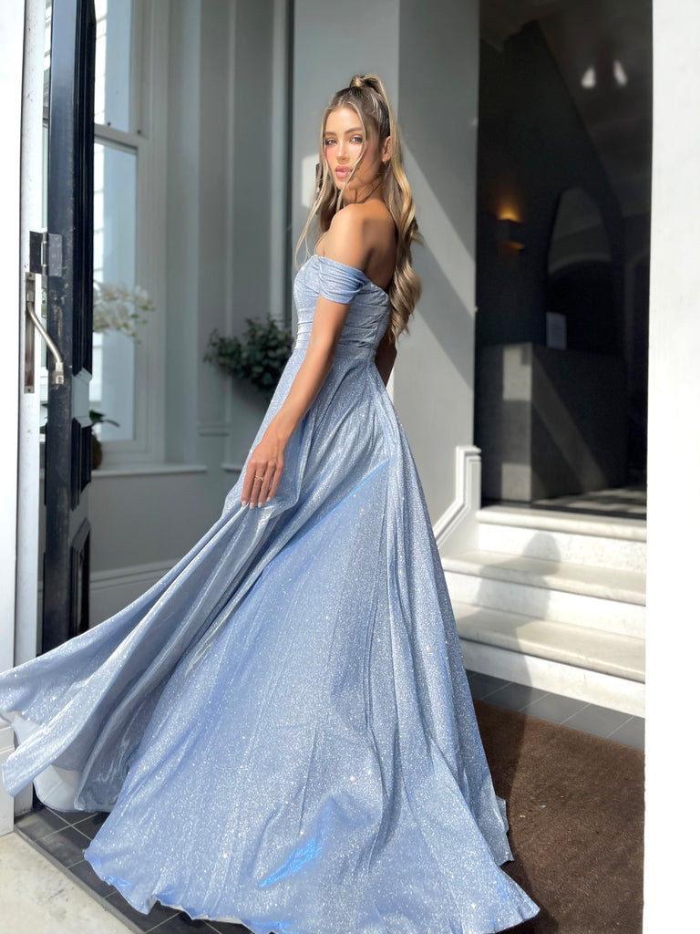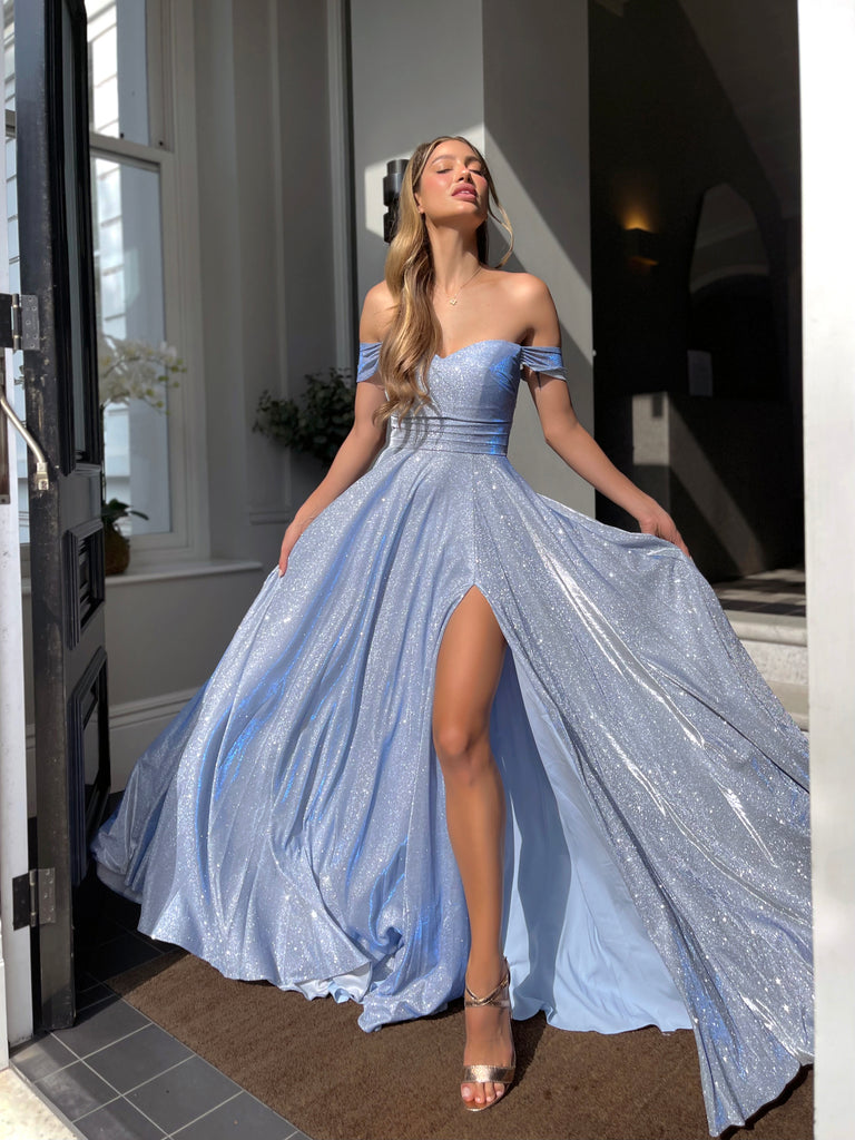 A gorgeous of the shoulder gown by Australian Designer Jadore style JP127. This beautiful dress comes in 4 different colours. The dress features full floor length sparkle with a sweetheart neckline and swag sleeves to give a romantic bodice, whilst the floor length skirt and side split gives it a glamorous feel.