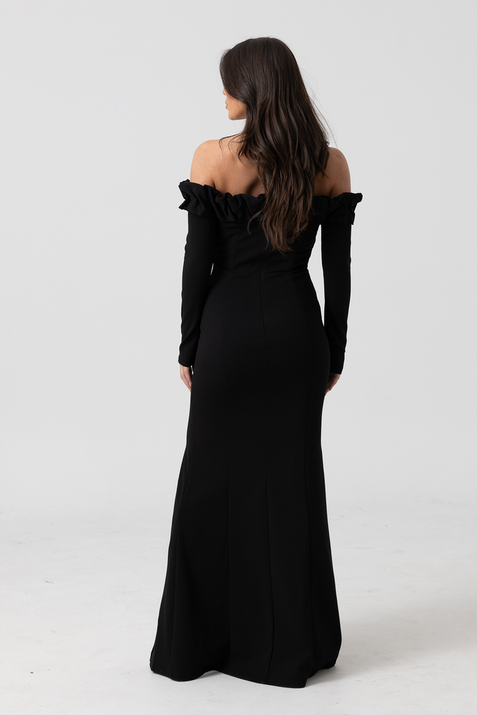 Indulge in the luxurious Aria Off The Shoulder Maxi, crafted by Australian Designer Romance The Label. This stunning dress boasts an alluring off the shoulder neckline, charming ruched detail, and graceful long sleeves. The figure-flattering maxi is completed with a stunning mermaid-style skirt and a daring side slit, making it the perfect epitome of elegance and playfulness in one.