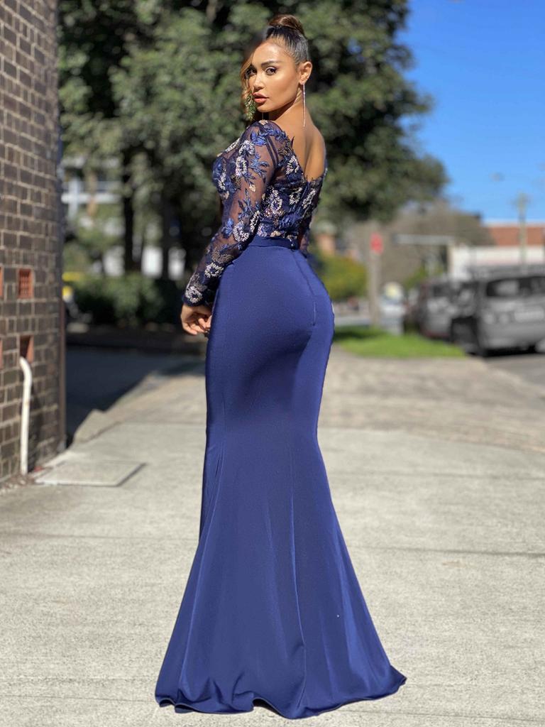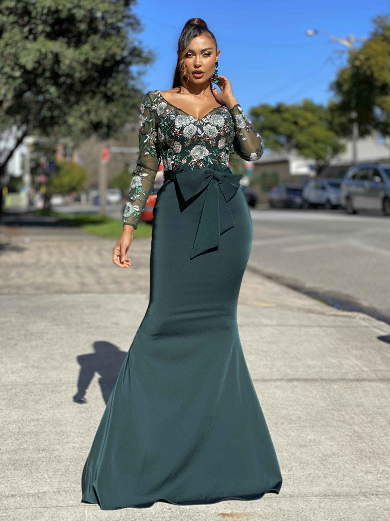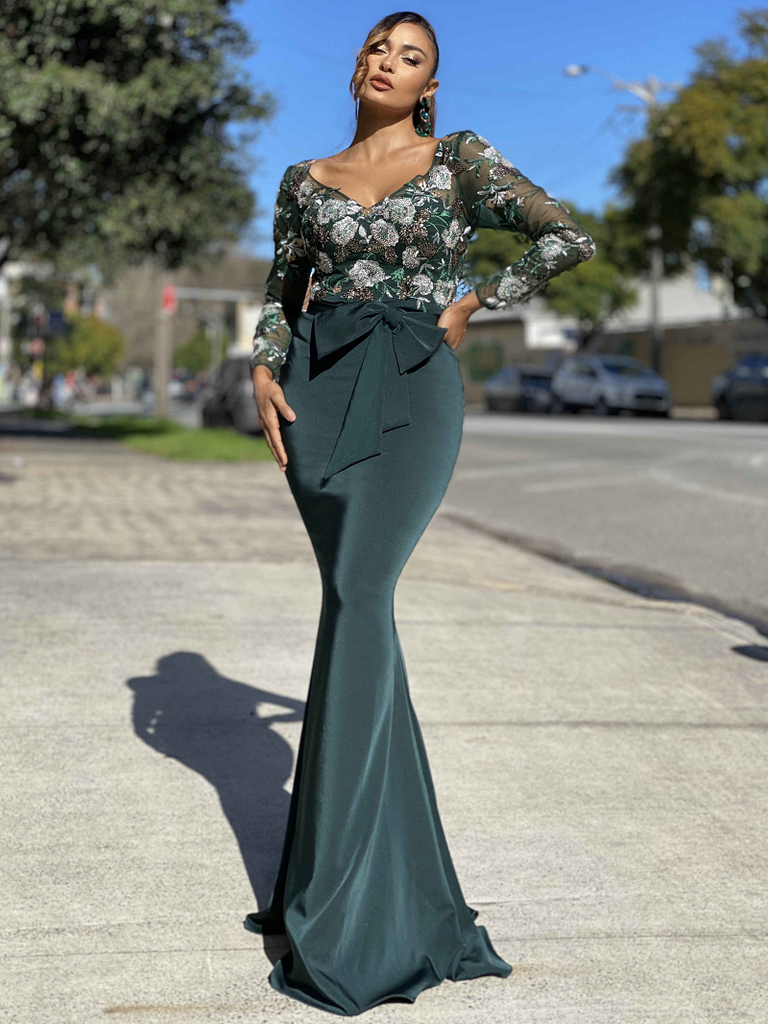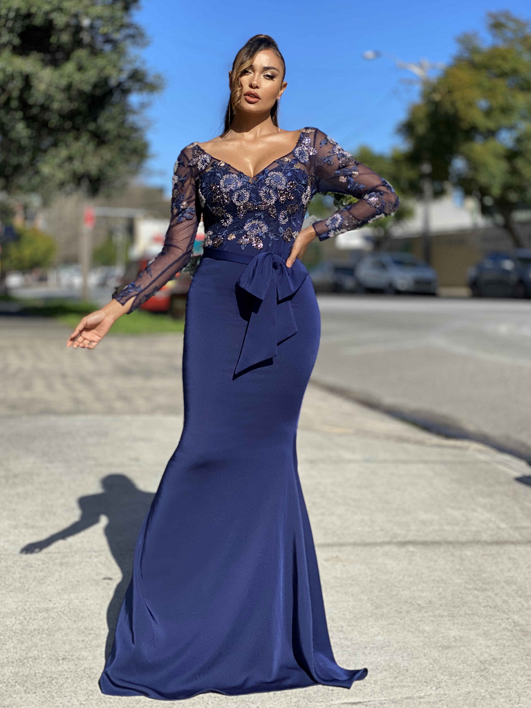 A gorgeous full length gown by Australian Designer Jadore, Style JX4018. The Athena Gown features a v-neckline, as well as long, sheer sleeves, and a bodice detailed with a beautiful floral applique detailing. Cinched at the waist with a gorgeous waist tie detailing, this form fitting gown is finished with a mermaid style skirt.