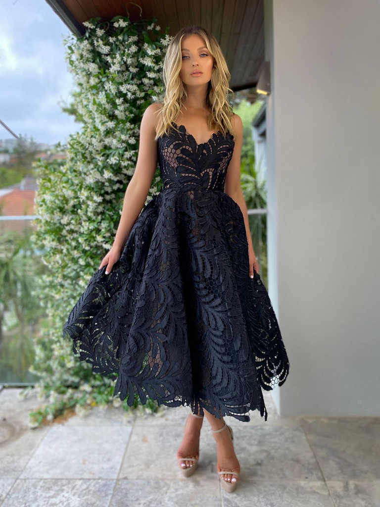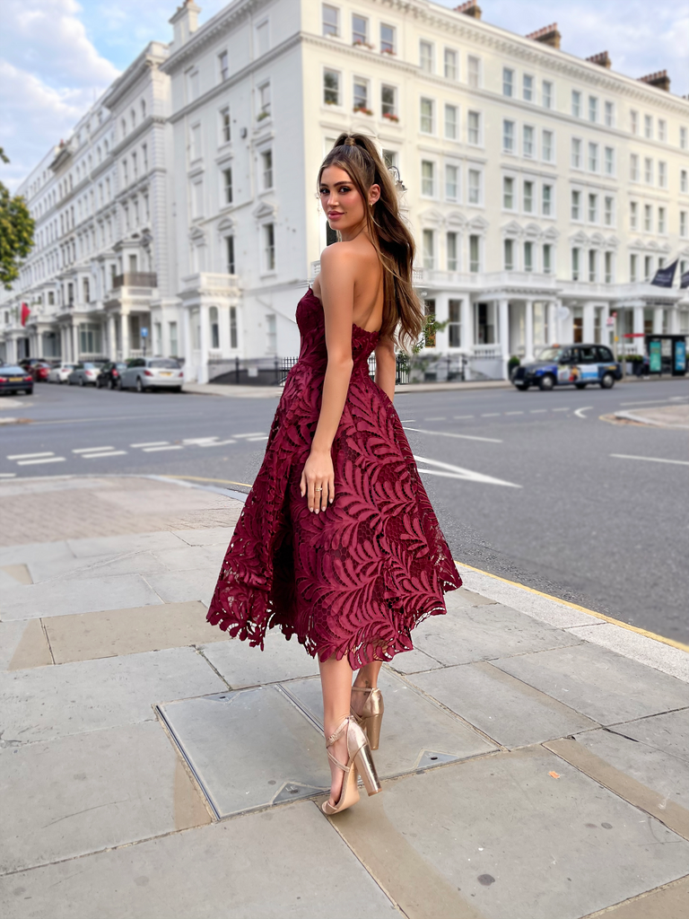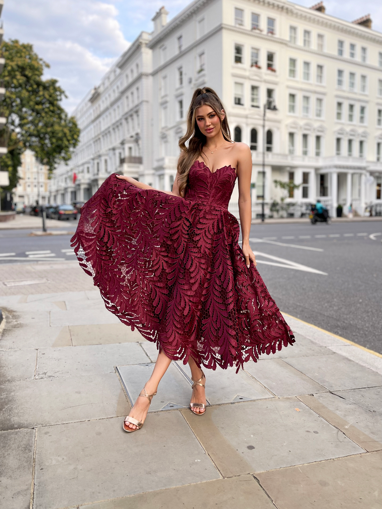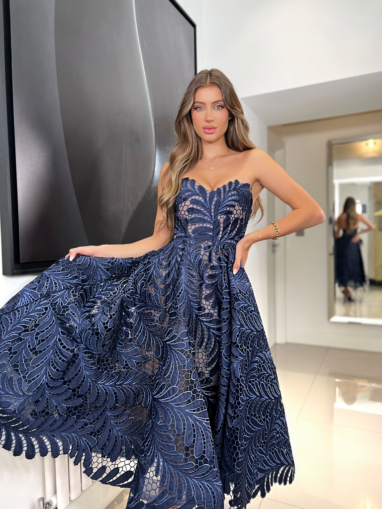 A beautiful midi length dress by Australian Designer Jadore, Style JX5031. A lovely lace detailing covers the length of the Belle Midi, which also features a strapless, sweetheart neckline. The Belle Midi is cinched at the waistline before flaring out to create the classic A-line silhouette.