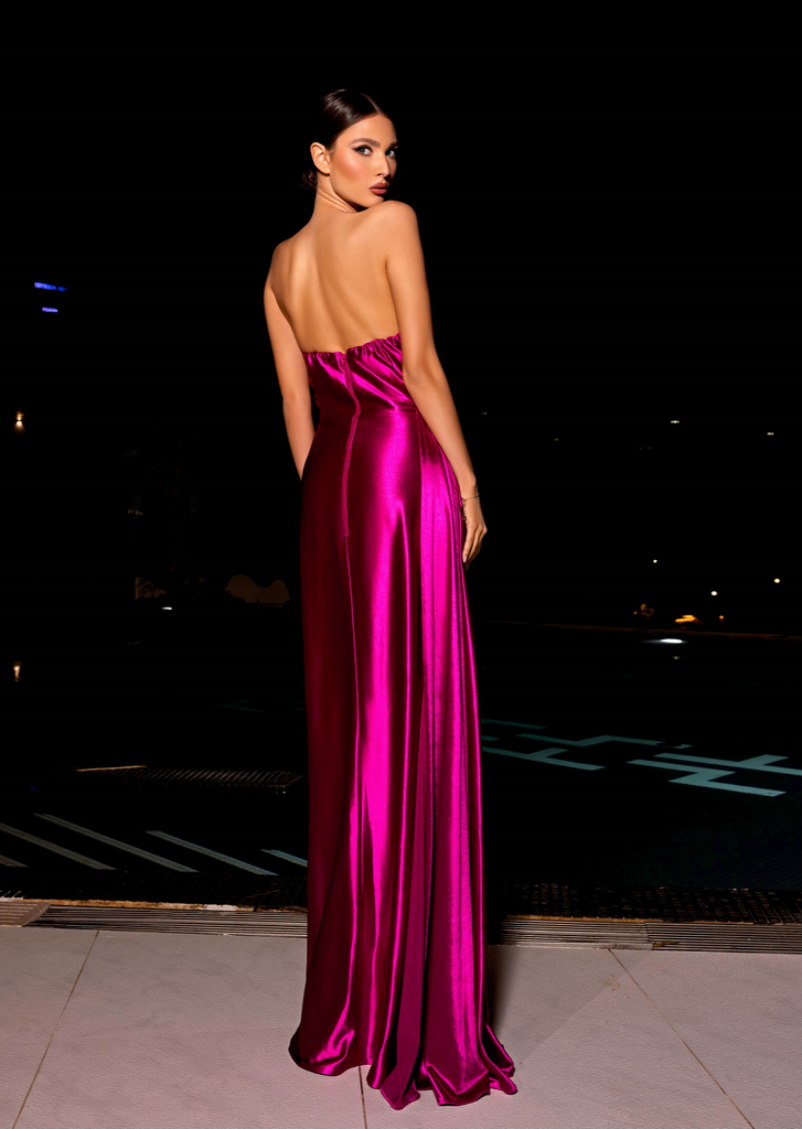 An eye-catching, floor-length dress by Australian Designer Nicoletta, Style NC2009. The Brea Gown, crafted from our stunning gloss stretch jersey fabric, boasts a tantalizing strapless V-neckline and a cinched waistline with flattering ruching. The pencil skirt is elegantly accented with a playful overlay piece at the side.