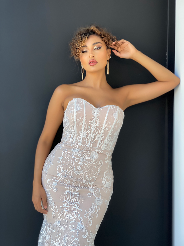 A beautiful full length gown by Australian Designer Jadore, Style JX4062. Featuring a strapless, sweetheart neckline, this form fitting gown is finished with a mermaid style skirt complete with a small back train. A stunning lace applique detailing covers the length of the Calliope Gown.
