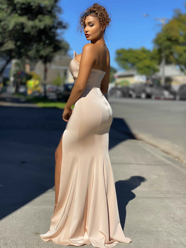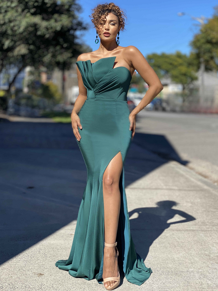 A lovely full length gown by Australian Designer Jadore, Style JX4046. The Camille Gown is a strapless style, which features both a 3D structured fold detailing and a pleated detailing along the semi-sweetheart neckline. This form fitting gown is finished with a mermaid style skirt, complete with a high, side split.