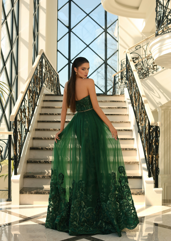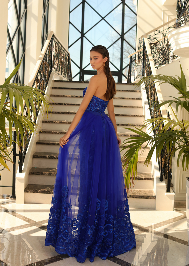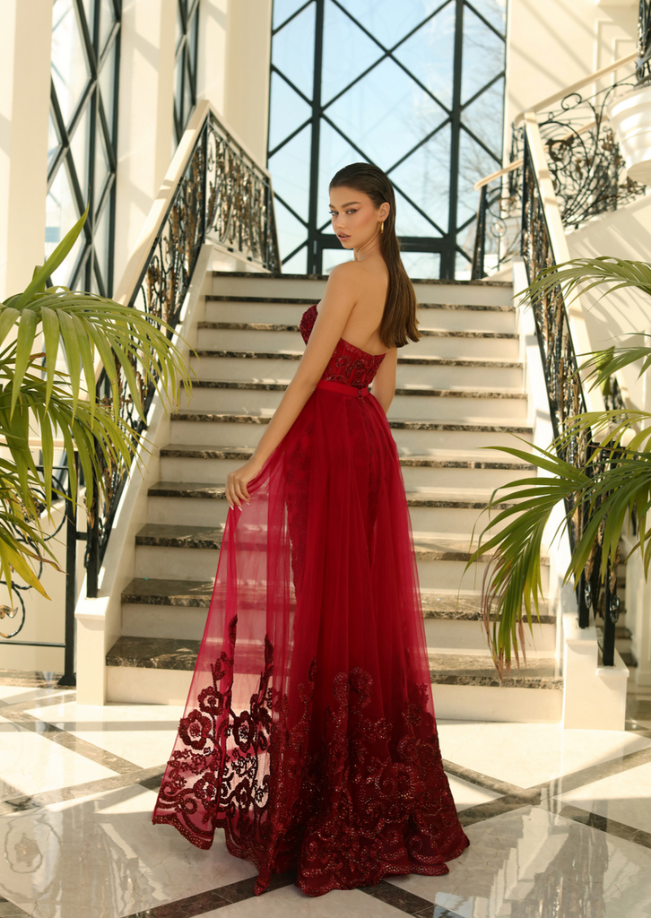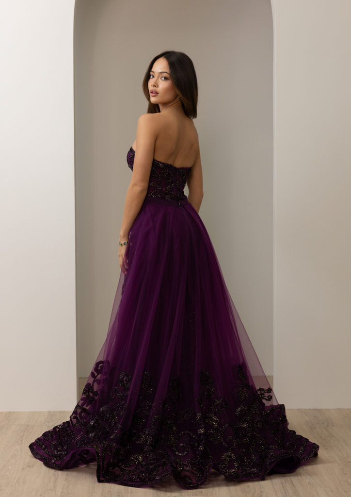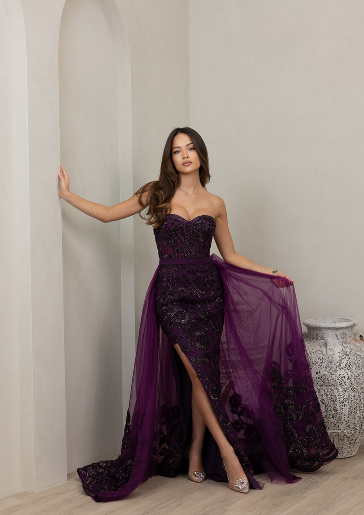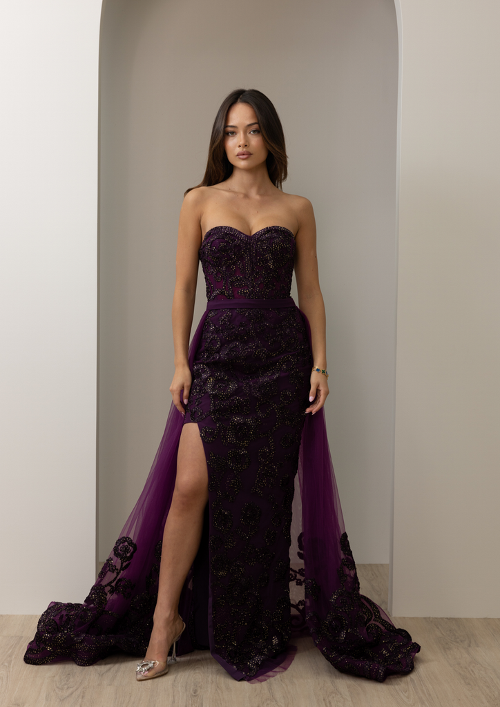 A sophisticated two-piece gown from Australian designer Nicoletta, style NC1003. The Carrie Gown offers a strapless sweetheart neckline and an inclusive detachable skirt. Show off your legs with the side split and complete the look with a sheer detachable overlay skirt adorned with detailing.