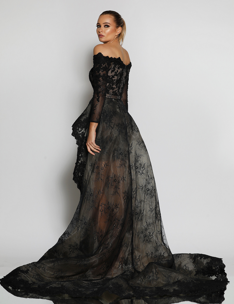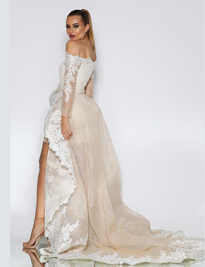 Unleash your inner fashionista with the Chiara Two Piece, a stunning lace two-piece creation by Australian designer Jadore (style JX1057). This ensemble features a midi dress with an off-the-shoulder sweetheart neckline, delicate lace sleeves, and a detachable skirt for versatility. Add a touch of whimsy with the sheer overlay adorned with intricate detailing.