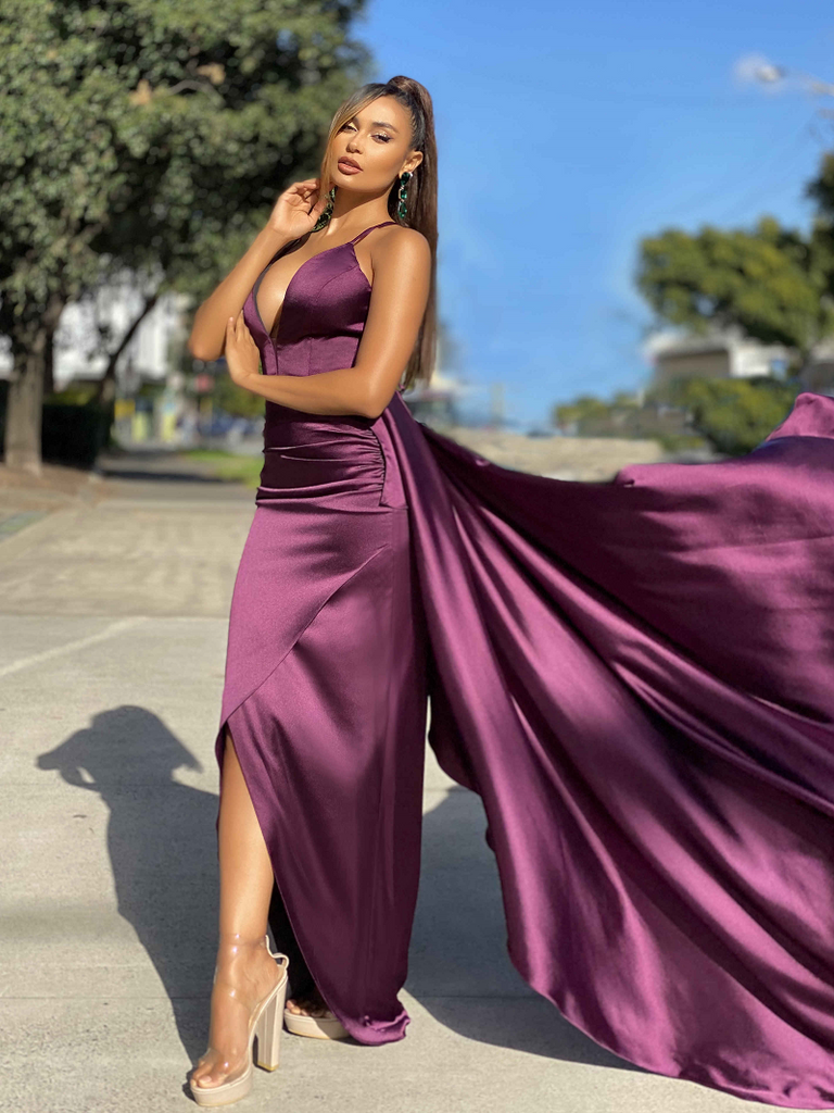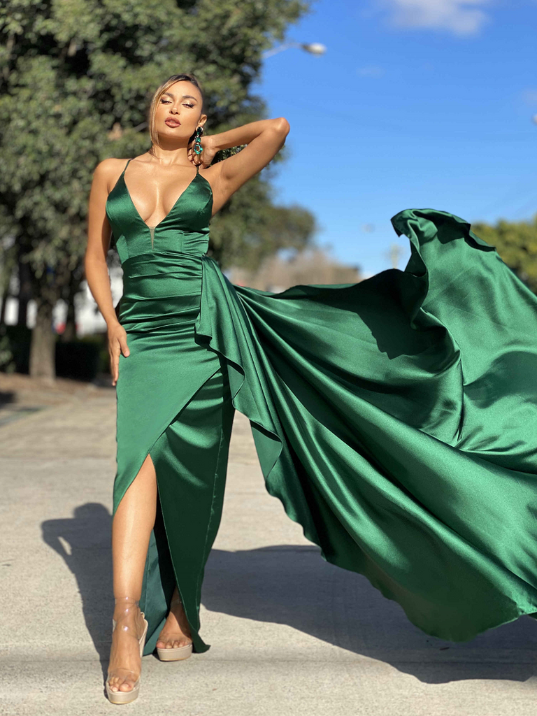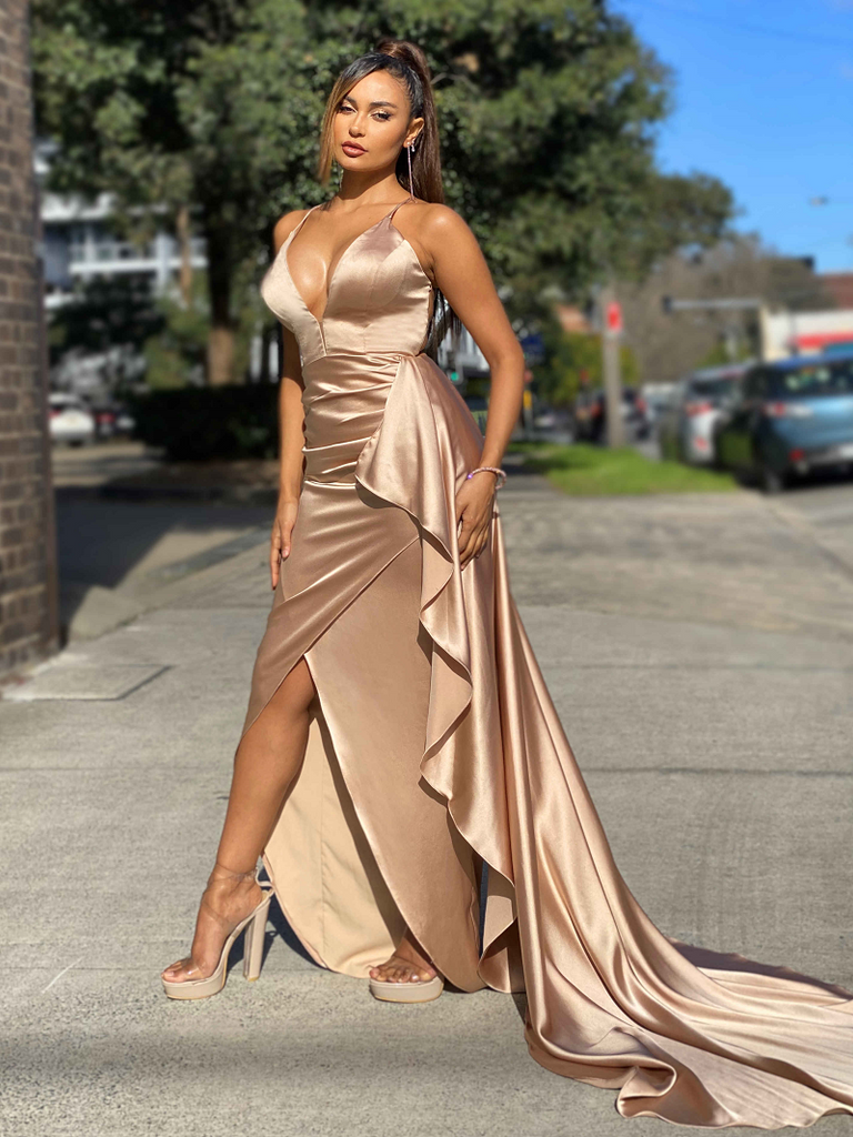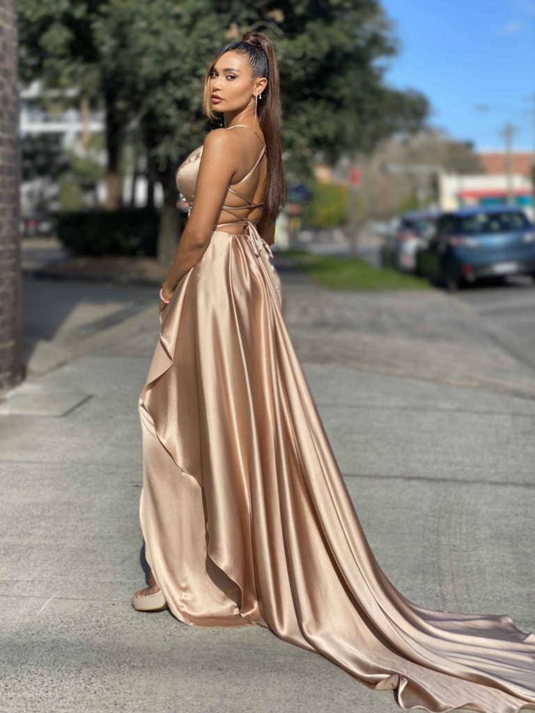 A beautiful full length gown by Australian Designer Jadore, Style JX4044. The Cleo Gown features a deep v-neckline, as well as a criss-cross back detailing, and is complete with a ruched detailing on the torso. This form fitting gown also features an asymmetrical side split complete with a gorgeous side drape detailing, so you can move with ease and dance the night away.