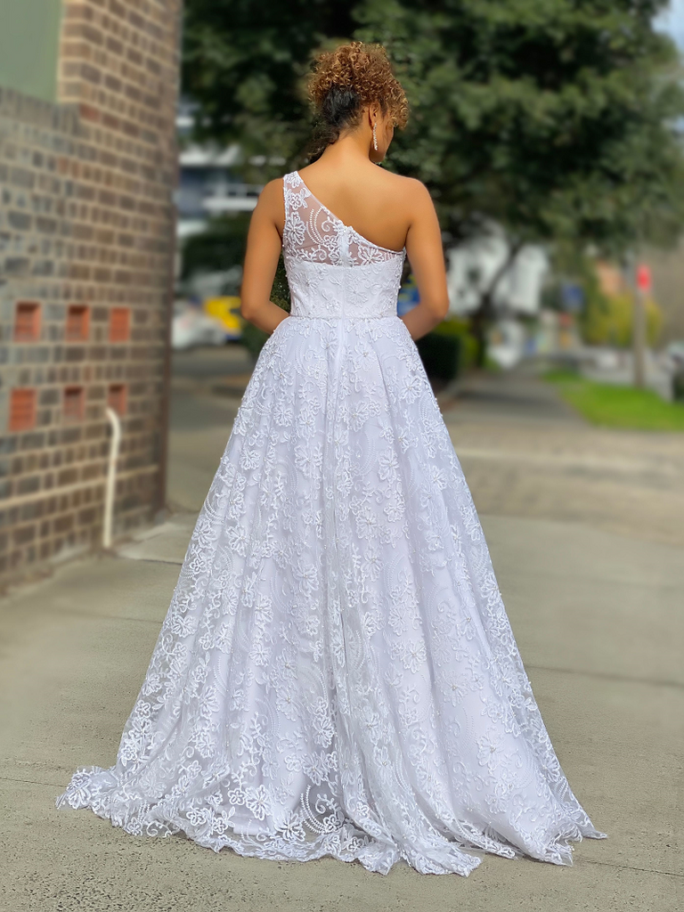 A beautiful full length gown by Australian Designer Jadore, Style JX4008. A gorgeous floral lace detailing complete with beading covers the length of the Cosette Gown. This gown is fitted at the waistline before flaring out to create the classic ball gown silhouette. This A-line style also features a sweetheart neckline complete with a one shoulder overlay detailing.