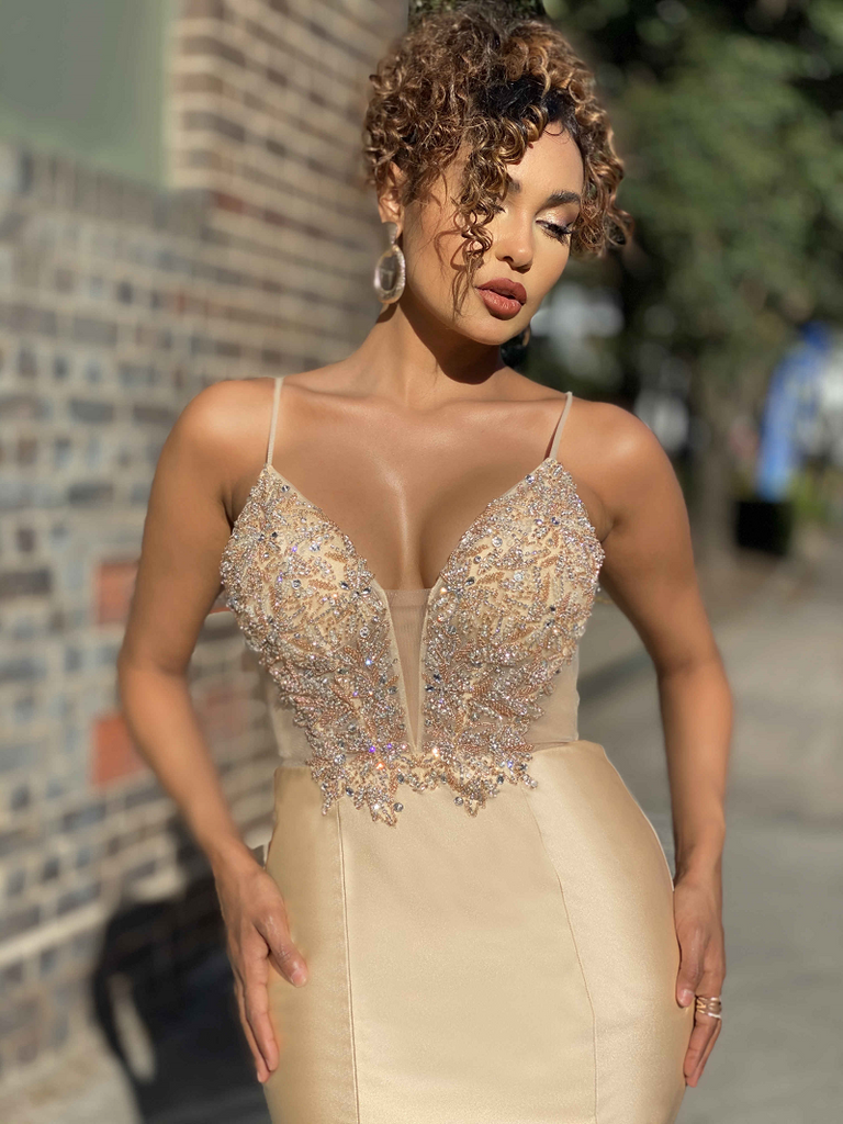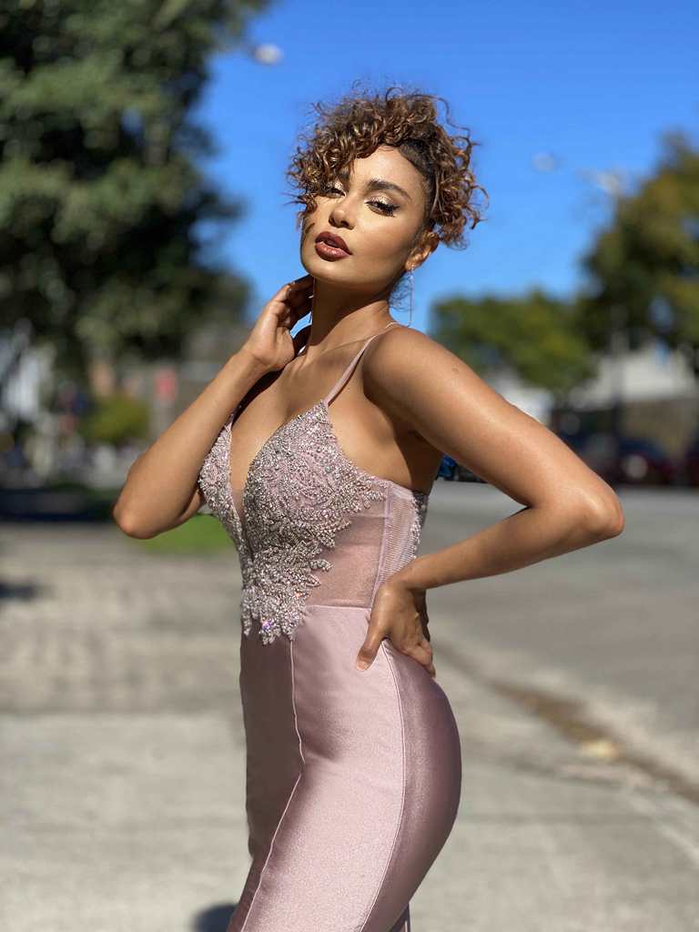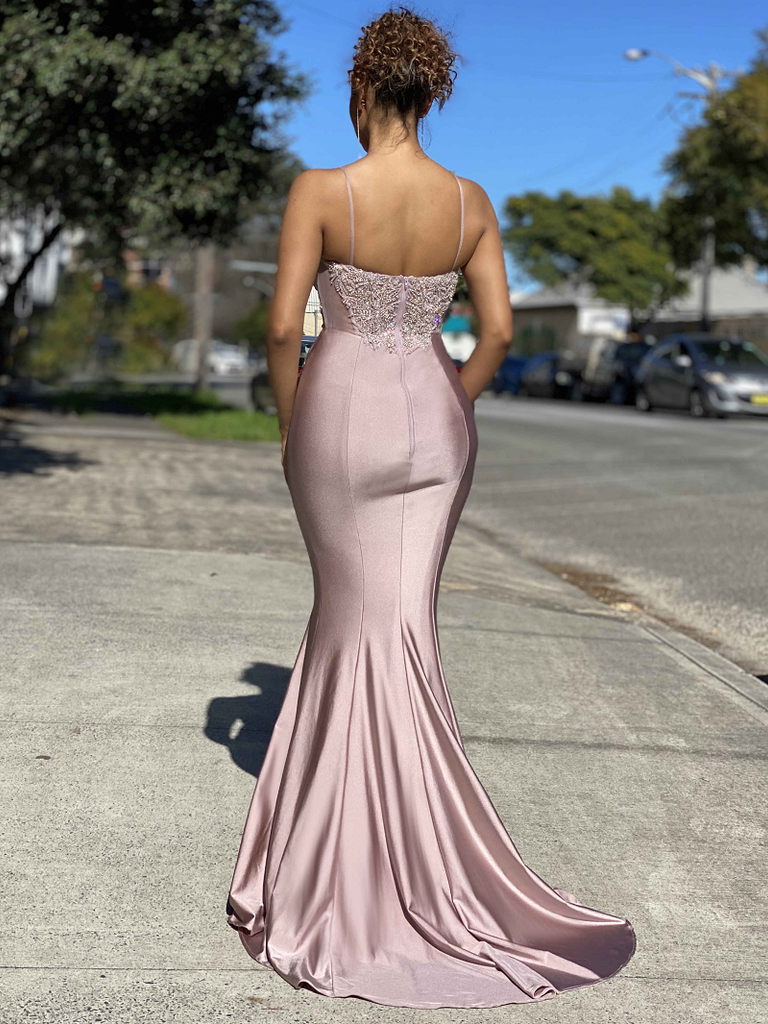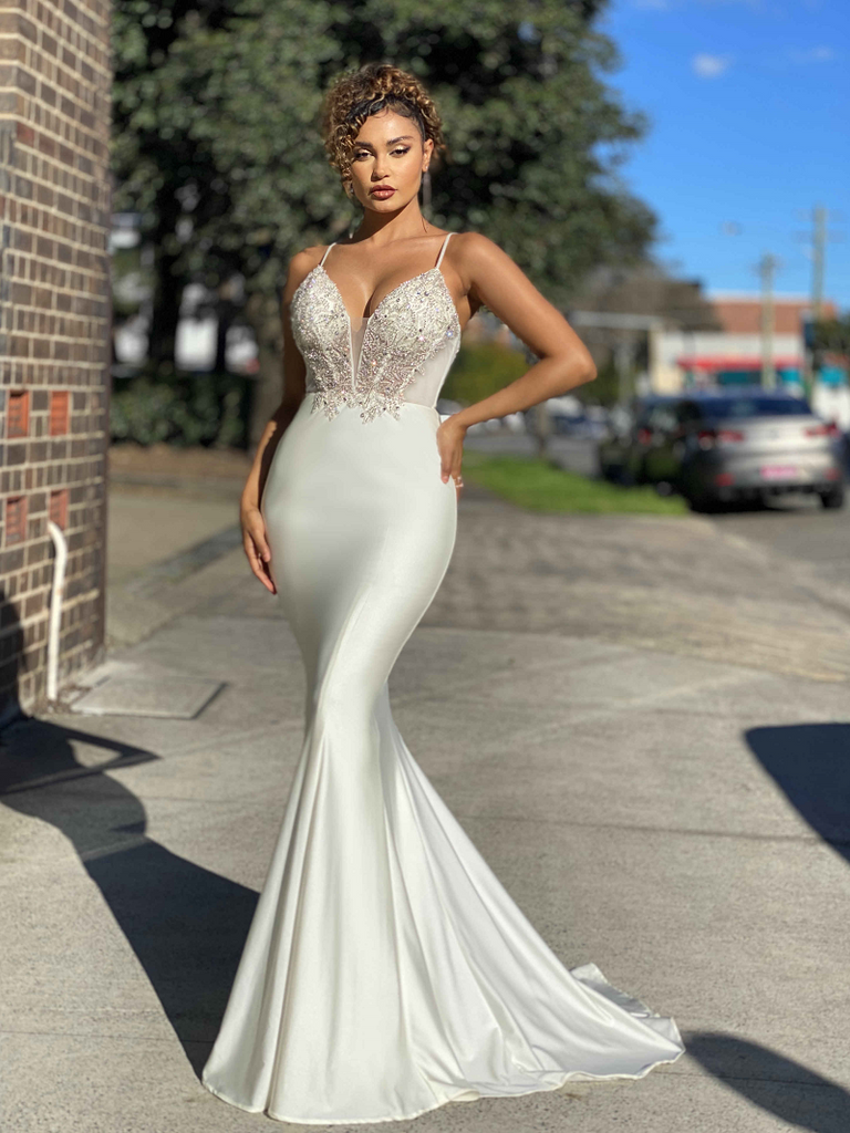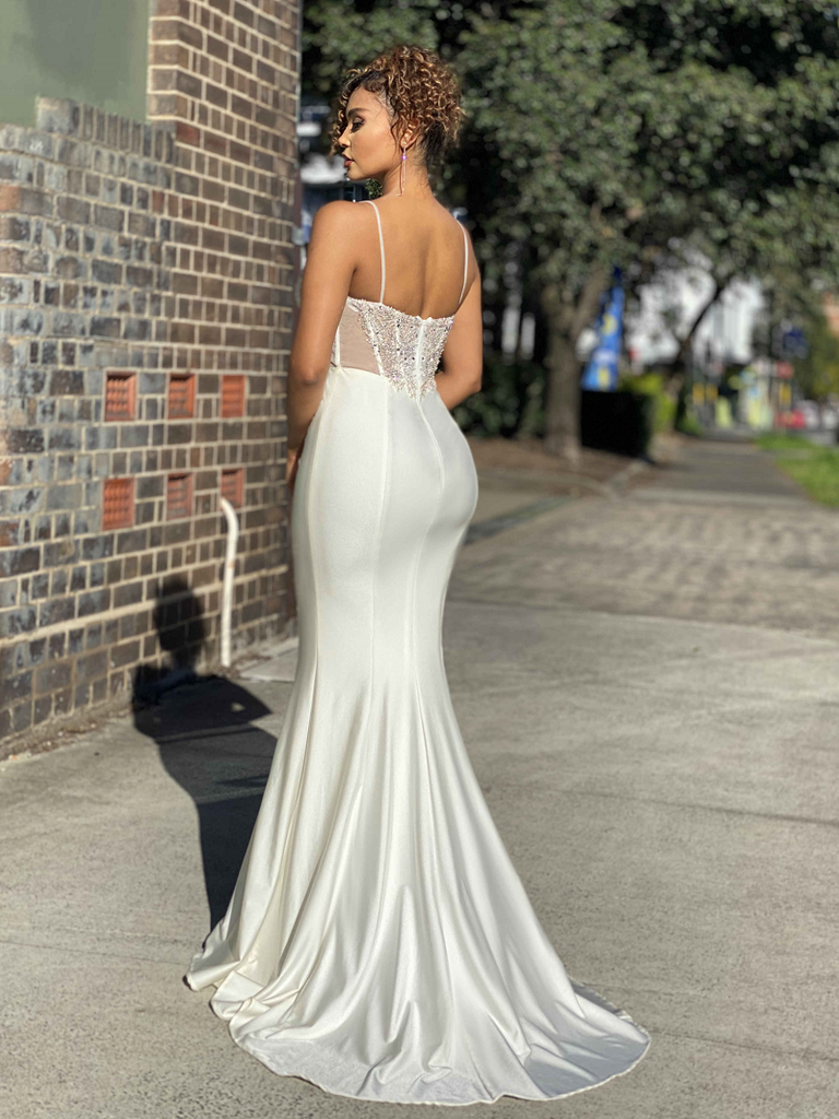A beautiful full length gown by Australian Designer Jadore, Style JX4077. Featuring a v-neckline with a mesh insert, a stunning sequin and beaded embellished detailing features both on the front and back of the bodice of the Cressida Gown, whilst a cut out sheer panelling features on the sides of the bodice, in between the sections of embellishments. This form fitting gown also features a satin, mermaid style skirt that is finished with a long back train.
