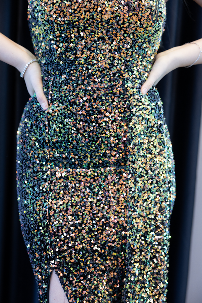 A beautiful full length gown by Australian Designer Romance The Label. Featuring a strapless, sweetheart neckline, This stunning two tone sequin detailing covers the length of this gorgeous dress. This form fitting gown also features a side split complete with a gorgeous side drape detailing so you can move with ease and dance the night away.