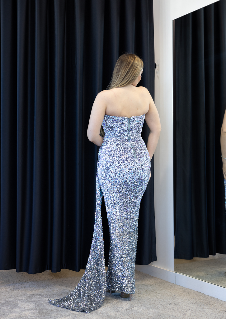 A beautiful full length gown by Australian Designer Romance The Label. Featuring a strapless, sweetheart neckline, This stunning two tone sequin detailing covers the length of this gorgeous dress. This form fitting gown also features a side split complete with a gorgeous side drape detailing so you can move with ease and dance the night away.