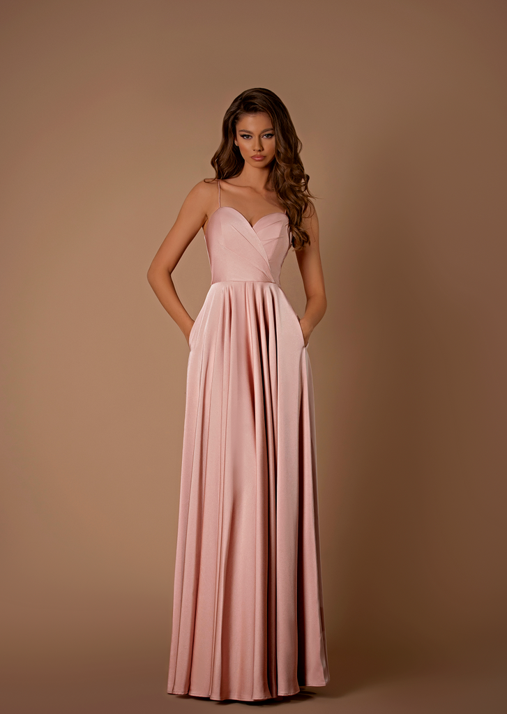 The Enslee gown, designed by Australian Nicoletta, is a stunning full-length dress (Style NBM1031) with a playful twist. Its bodice features a sweetheart neckline, cross-over design, and gathered detailing, along with spaghetti straps. The cinched waistline creates a flattering A-line silhouette, while the flowing skirt adds a touch of whimsy. Oh, and did we mention it has pockets?