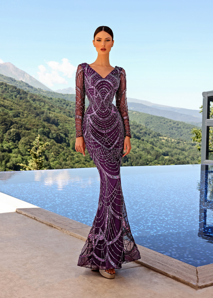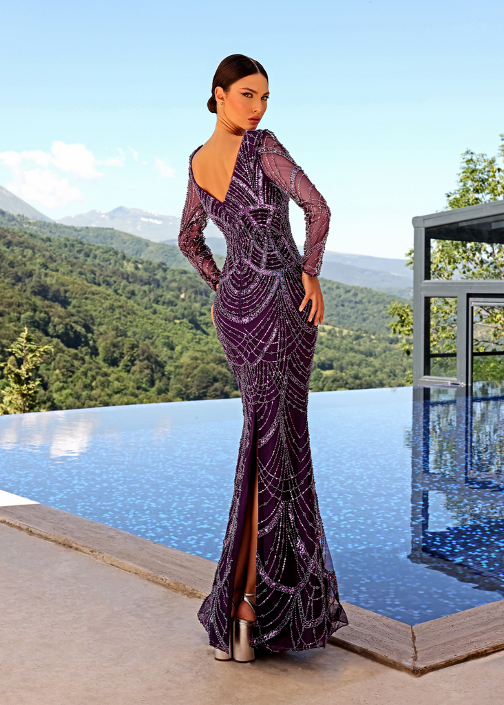 Introducing the Crystal Gown by renowned Australian Designer Nicoletta, Style NC2004 - it's a true head-turner! With exquisite beadwork and a sleek slim fit, this dress also features a seductive V-neckline and trendy, form-fitting sleeves. To top it off, there's a flattering back split for the perfect finishing touch. Prepare to be breathless!