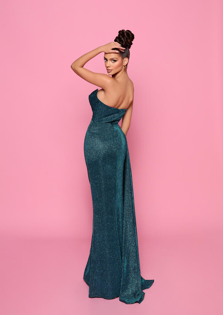 A stunning full length gown by Australian Designer Nicoletta, Style NP149. The Gatsby Gown made in our gorgeous Lurex fabric, features a strapless V neck design, and is cinched at the waistline before the pencil skirt ruffles finishing with a overlay piece to the side.