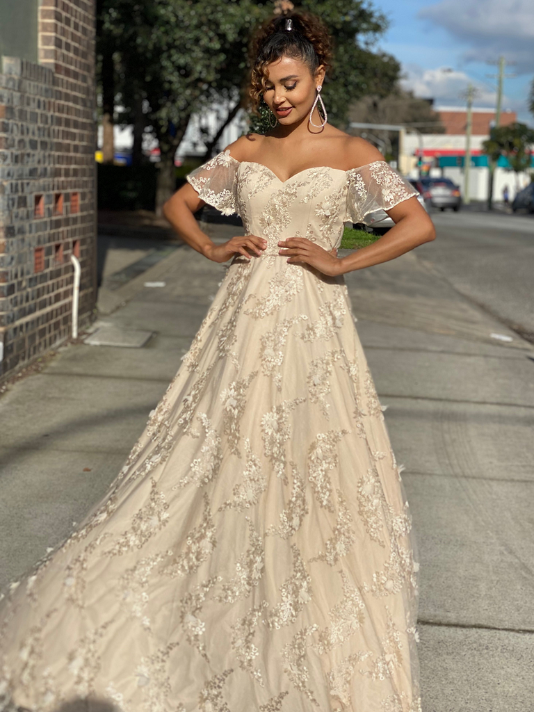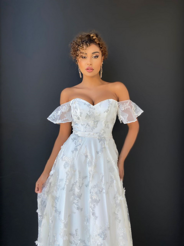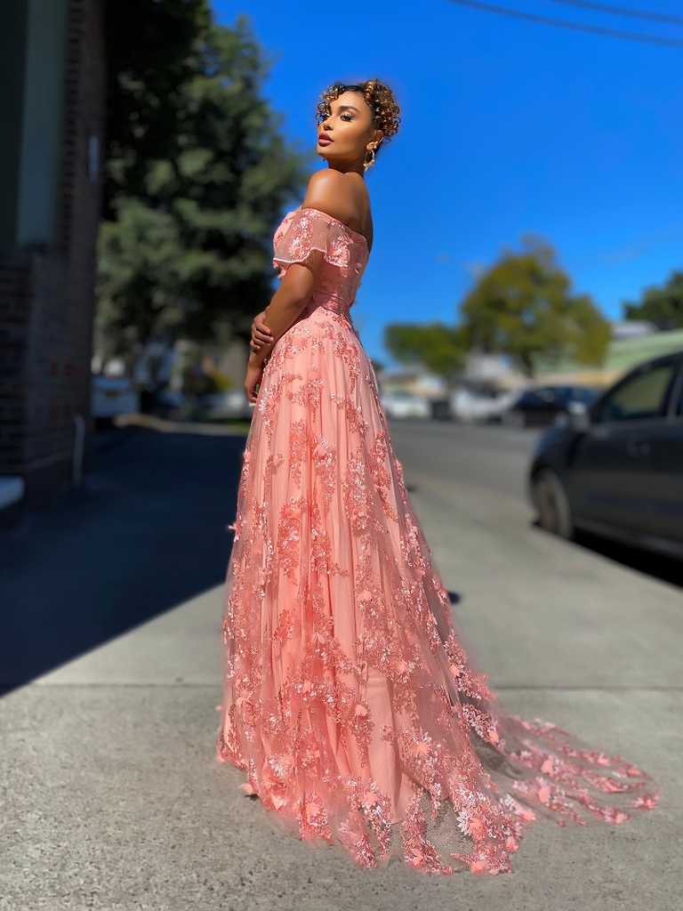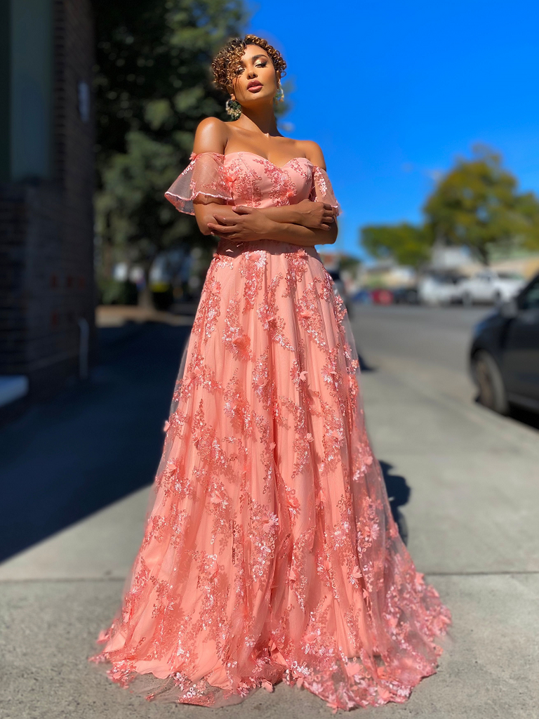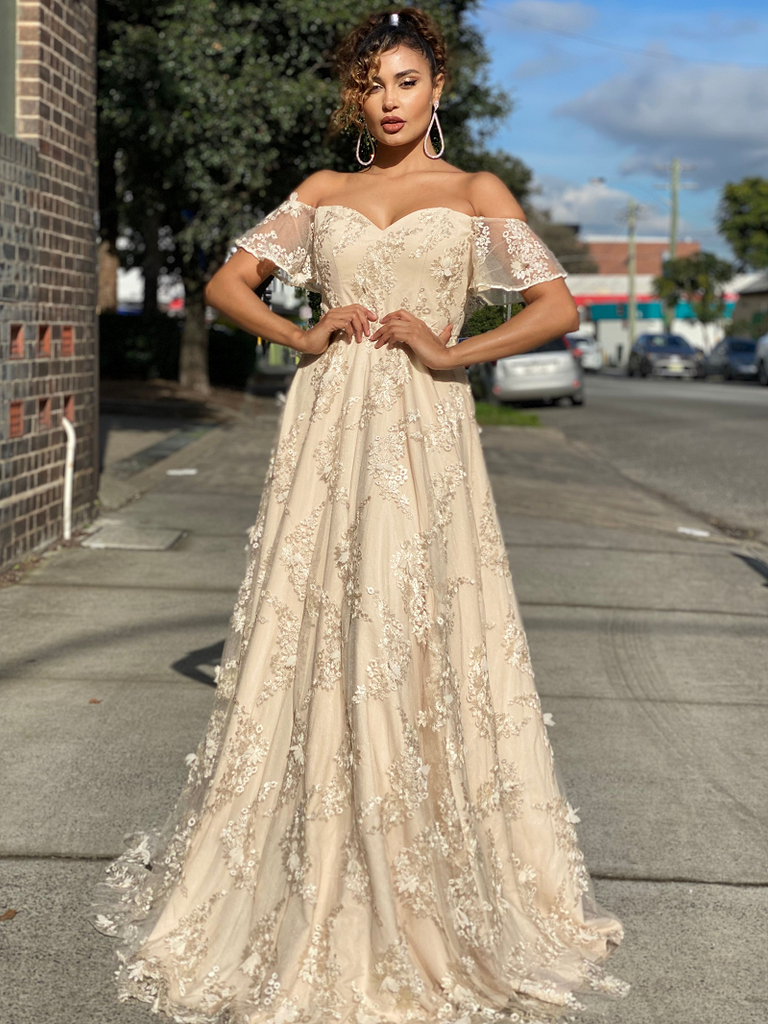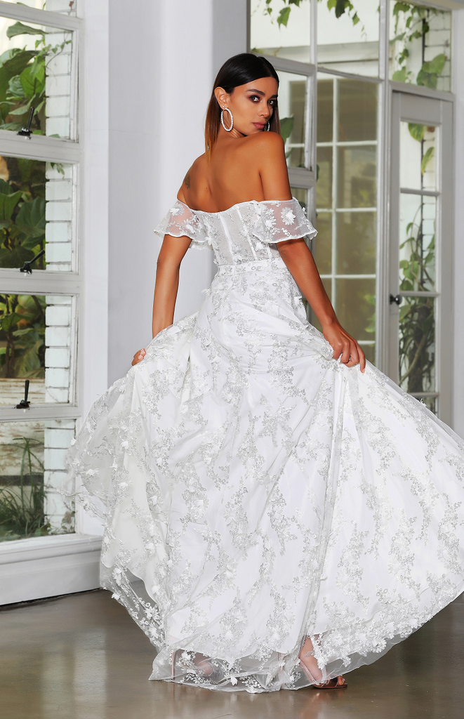 A stunning full length gown by Australian Designer Jadore, Style JX4009. A gorgeous lace applique detailing complete with 3D Florals covers the length of the Gianna Gown. Featuring a sweetheart neckline with off the shoulder, frill sleeves, and a semi-sheer bodice, this gown is fitted at the waistline before flaring out to create the elegant A-Line silhouette.