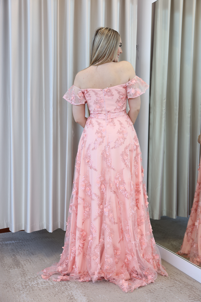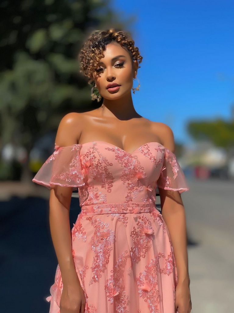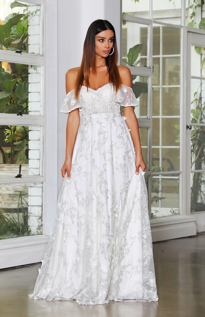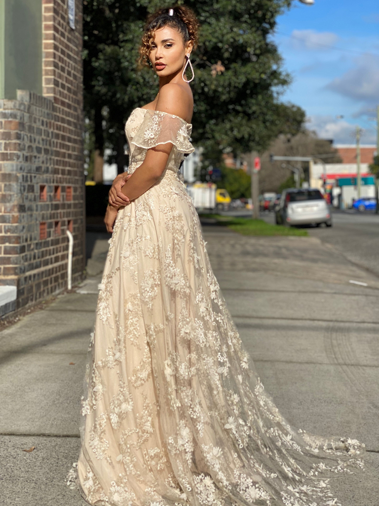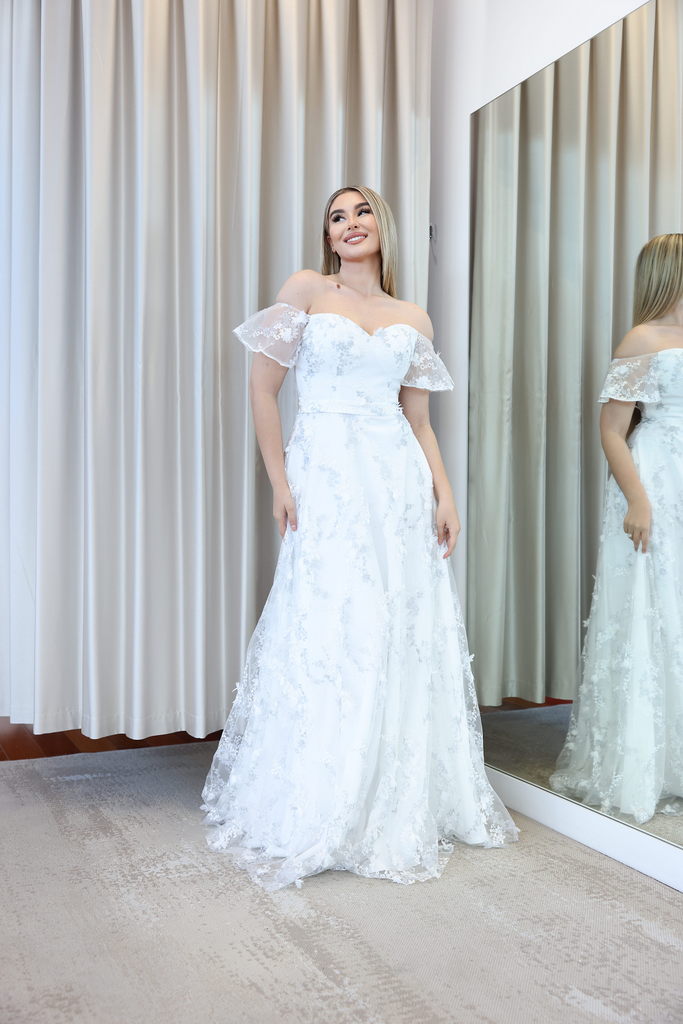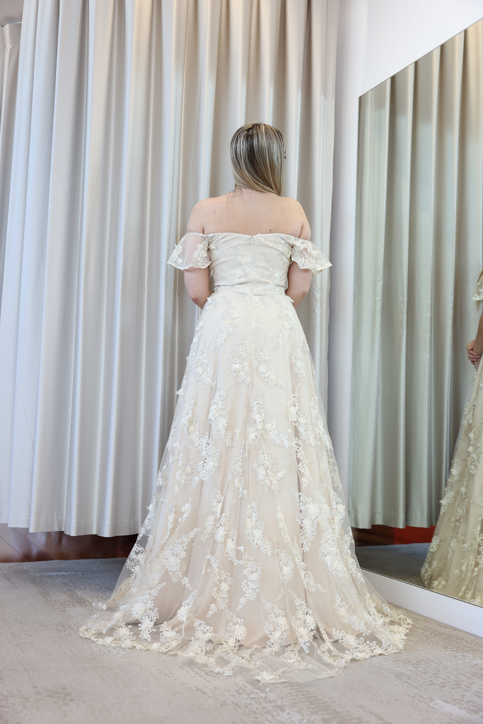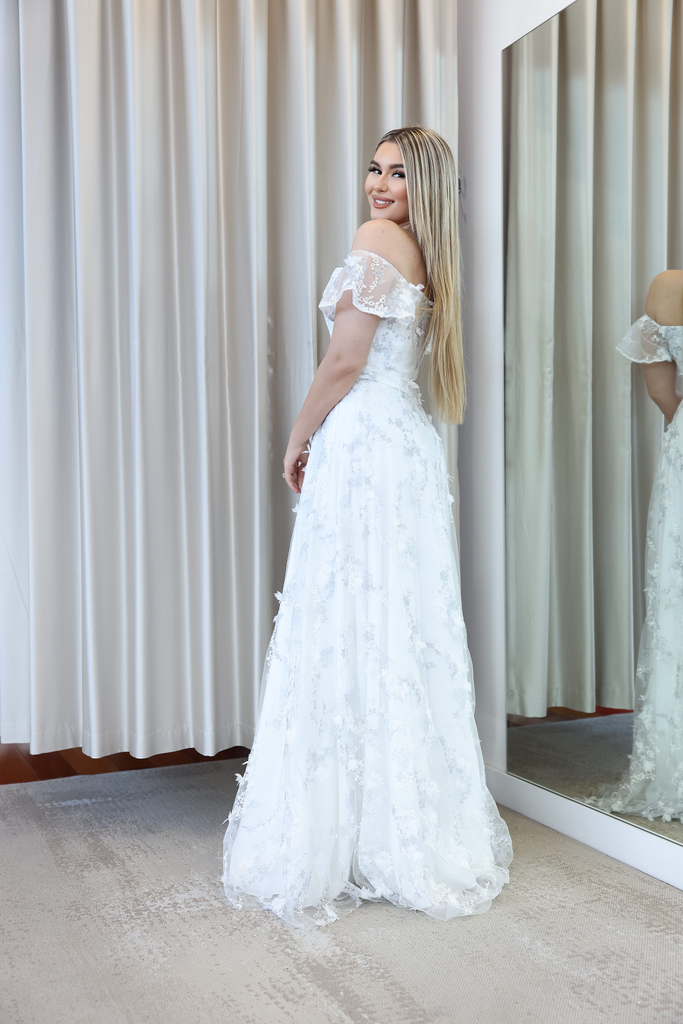 A stunning full length gown by Australian Designer Jadore, Style JX4009. A gorgeous lace applique detailing complete with 3D Florals covers the length of the Gianna Gown. Featuring a sweetheart neckline with off the shoulder, frill sleeves, and a semi-sheer bodice, this gown is fitted at the waistline before flaring out to create the elegant A-Line silhouette.
