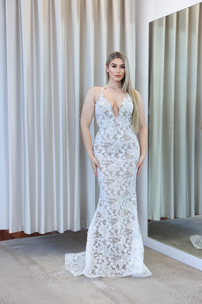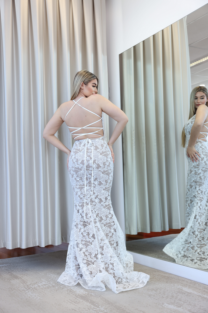 A beautiful full length gown by Australian Designer Jadore, Style JX6095. The Hansel Gown features a plunging v-neck bodice set with spaghetti straps that tie in a triangular fashion on the back. From the waist down, this dress is fitted to a mermaid hemline which adds a touch of classic red carpet elegance.