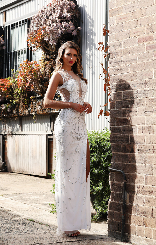 A beautiful full length gown by Australian Designer Jadore, Style JX3057. A stunning beaded embellished detailing covers the length of the Iman Gown. This form fitting gown also features a plunge neckline with beaded detailing and is finished with a side split.
