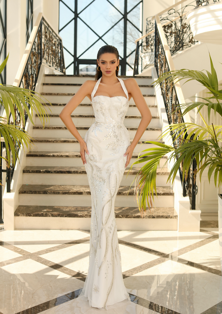 Get ready for a timeless and elegant experience with our Jolie Gown LUX013, created by the talented Nicoletta. This dazzling dress boasts a flattering halter neckline, delicate tulle overlay adorned with sparkling sequins and beads. Not to mention, the Jolie gown also flaunts a seductive low cut back, and a chic high back split.