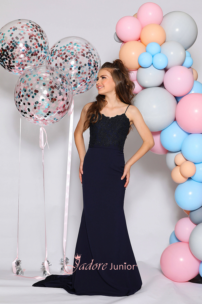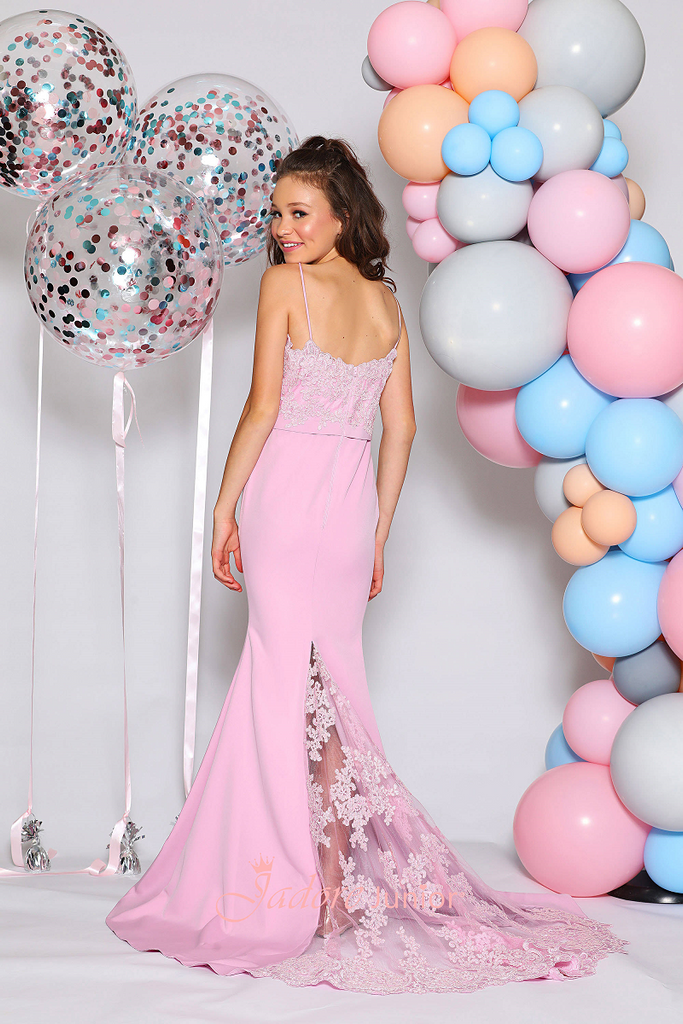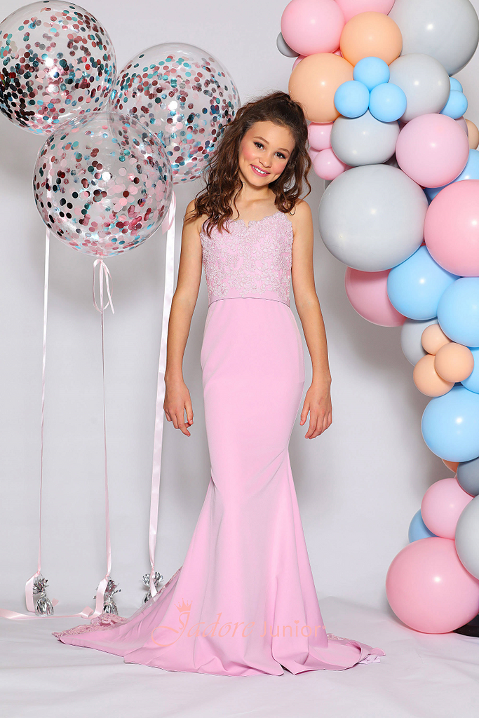 A beautiful full length dress by Australian Designer Jadore, Style JR05, from their Junior Collection. The bodice of the Glamour Dress features a gorgeous lace detailing, and also features a sweetheart neckline with spaghetti straps. Fitted at the waistline with a waistband, the Glamour Dress also features a mermaid style skirt and a lace detailed train.