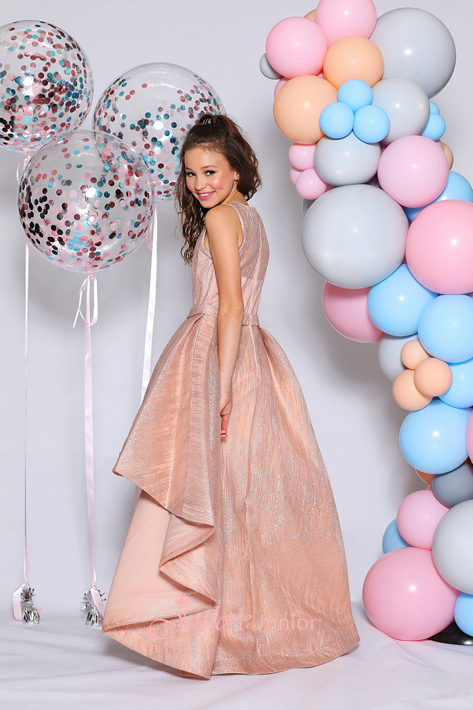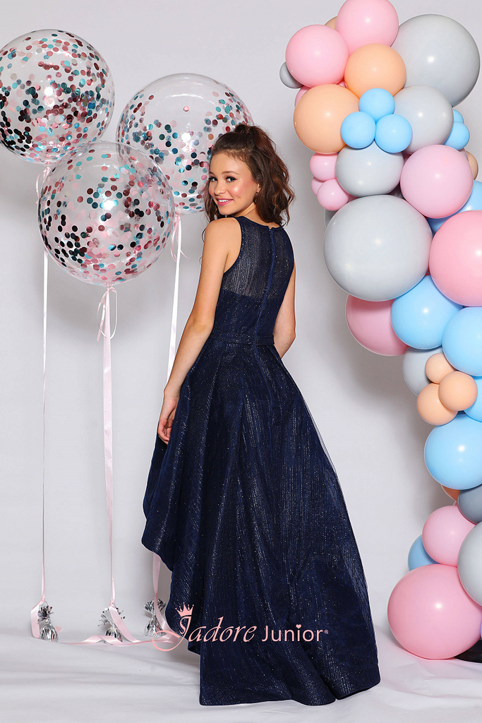 A gorgeous high low dress by Australian Designer Jadore, Style JR01, from their Junior Collection. A stunning glitter detailing covers the length of the Mira Dress, which also features a high, rounded neckline, with an illusion sweetheart neckline. The Mira Dress is fitted at the waistline before flaring out to create the beautiful High Low silhouette.