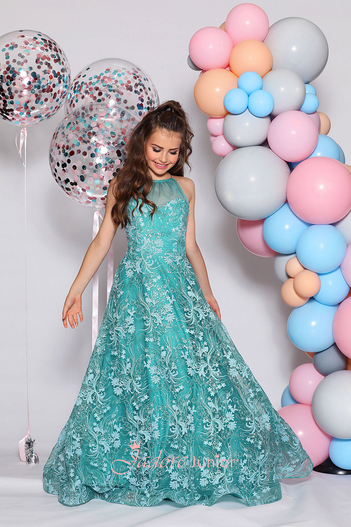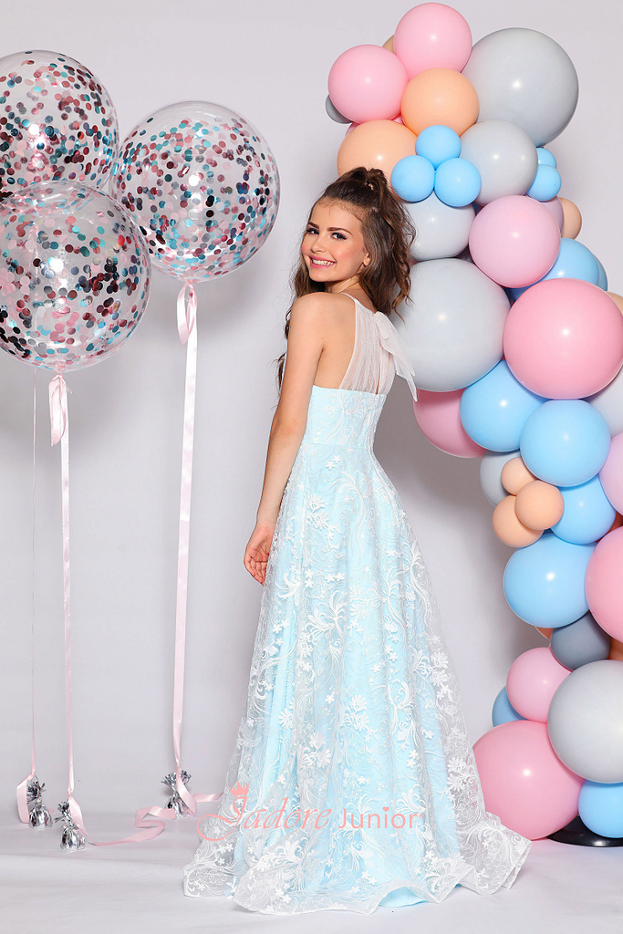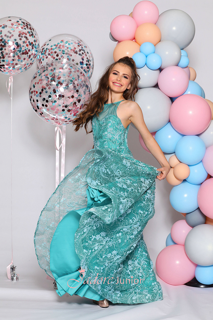 A lovely full length dress by Australian Designer Jadore, Style JR03, from their Junior Collection. The Primrose Dress features a mesh detailed, high, halter neckline, with an illusion sweetheart neckline. A gorgeous lace detailing covers the length of the Primrose Dress, which also features a tie back detailing, and is also fitted at the waistline before flaring out into a beautiful A-line style skirt.