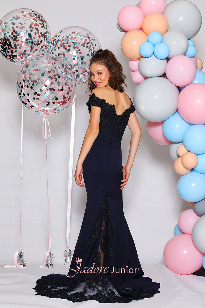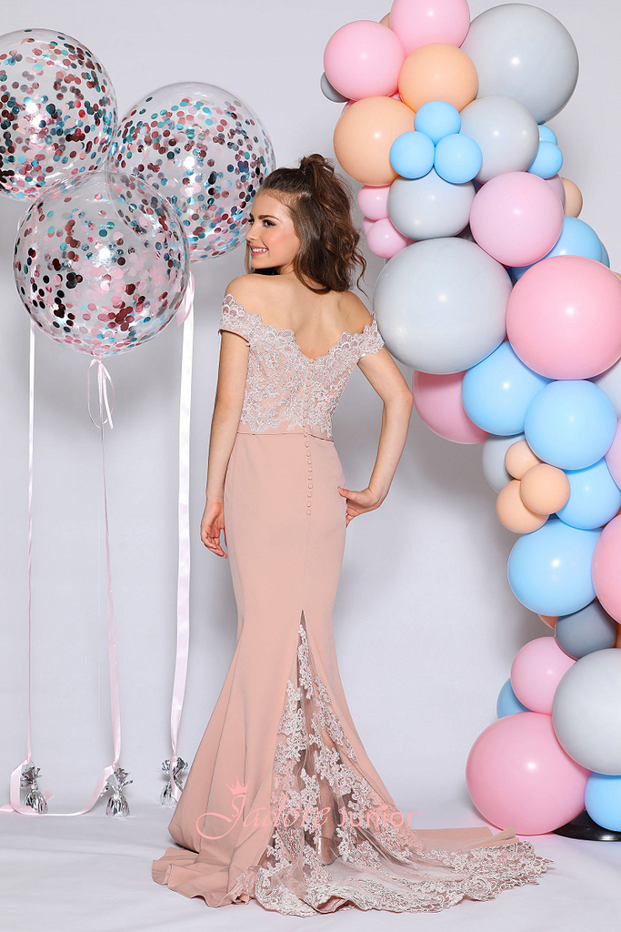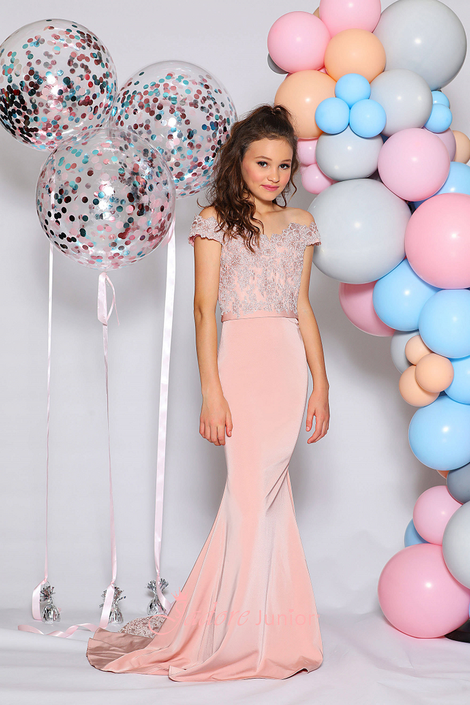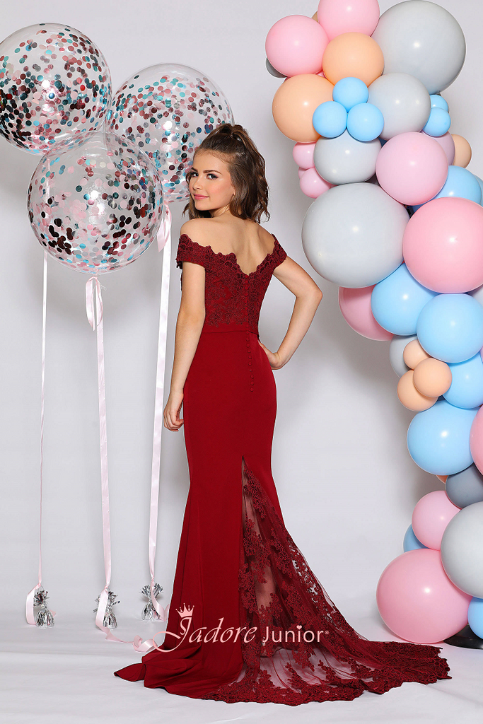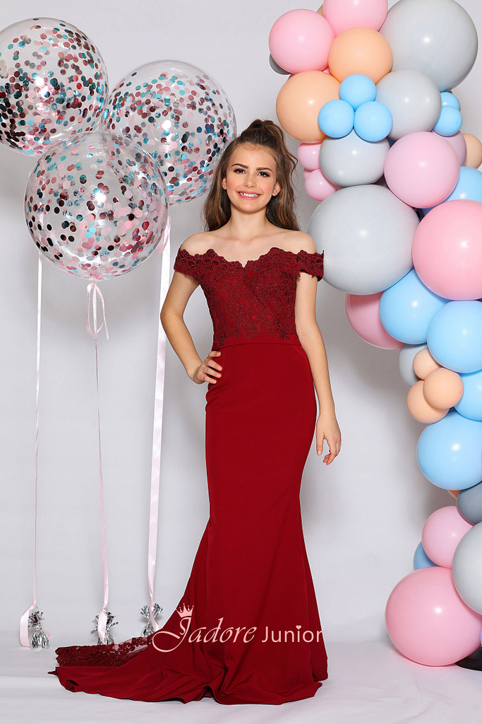 A gorgeous full length dress by Australian Designer Jadore, Style JR04, from their Junior Collection. The bodice of the Vogue Dress features a beautiful lace detailing, as well as an off the shoulder, sweetheart neckline. Fitted at the waistline with a waistband, the Vogue Dress is finished with a mermaid style skirt, complete with a lace detailed train.