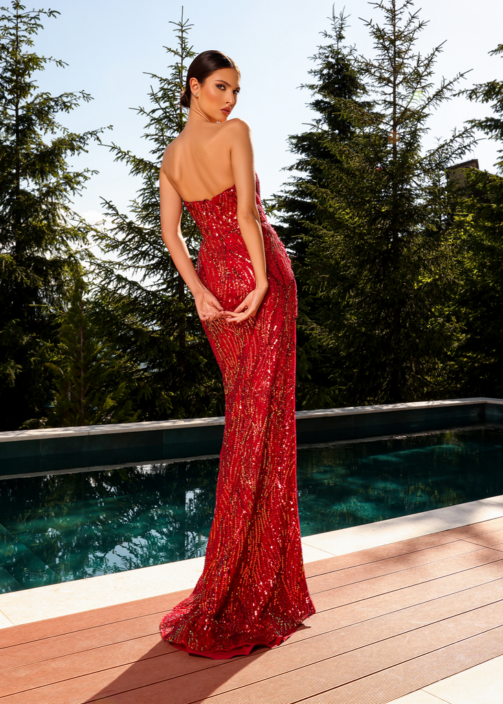 Experience the stunning beauty of the Nicoletta style NC2036 Juno Gown. This full-length dress boasts a strapless sequin-boned mesh corset and intricate sequin detailing. The sheer torso adds a hint of allure, while the thigh-high slit exude just the right amount of confidence. Make a statement and turn heads with this glamorous dress.